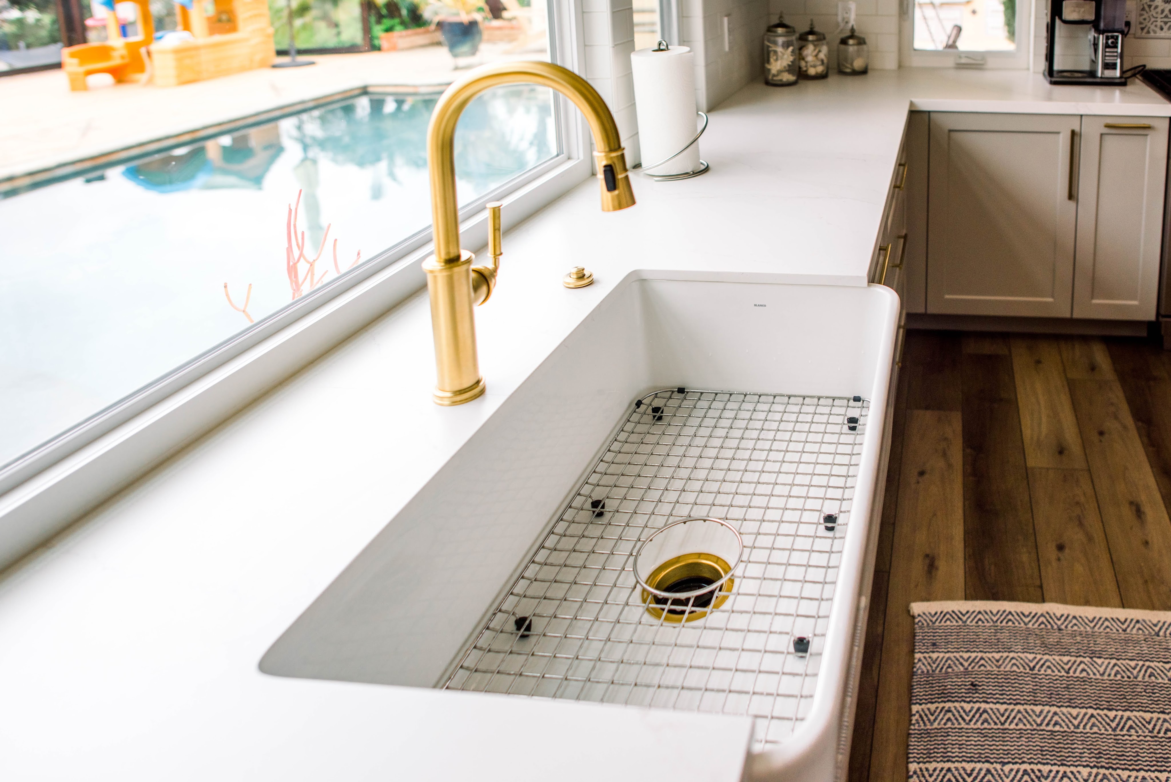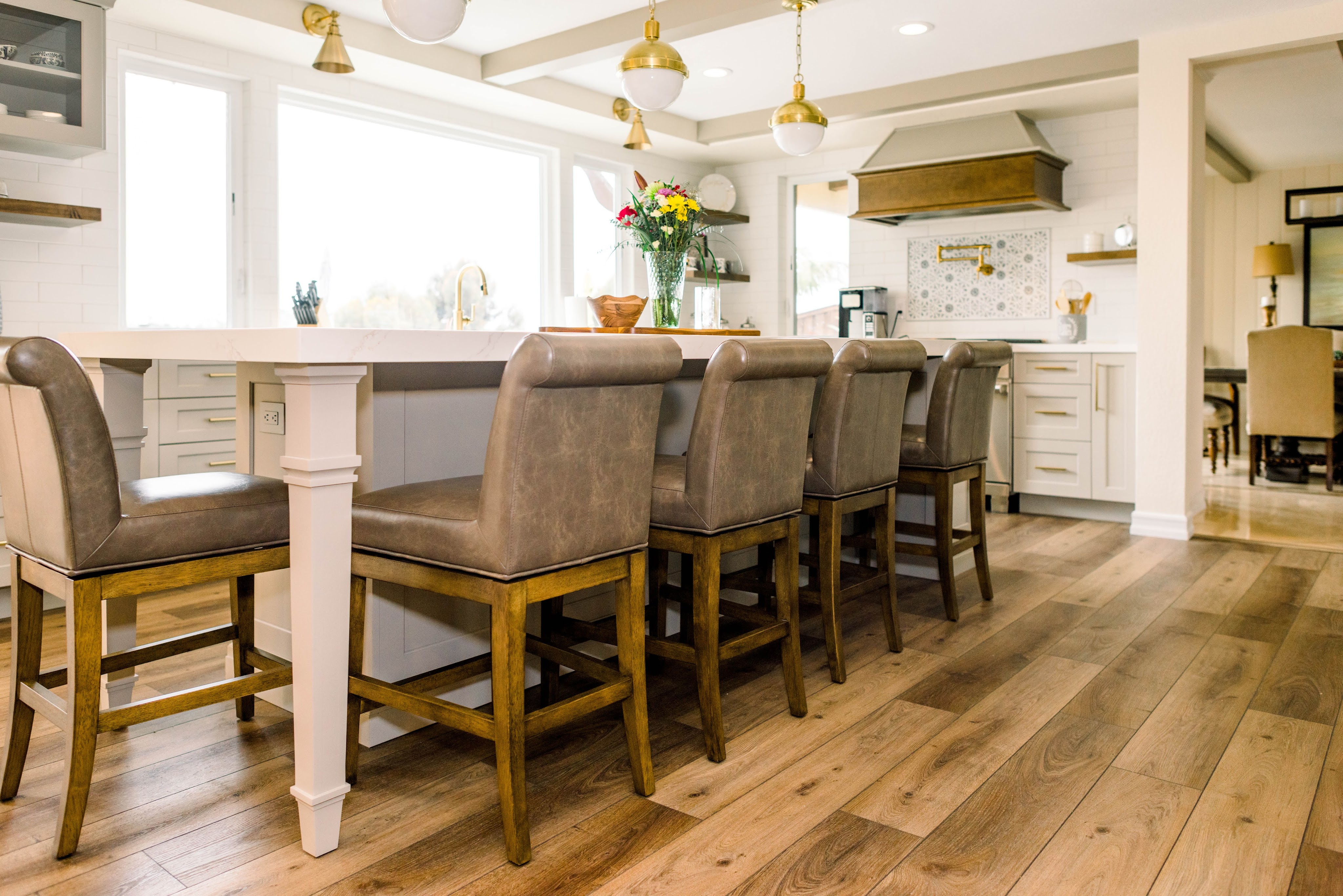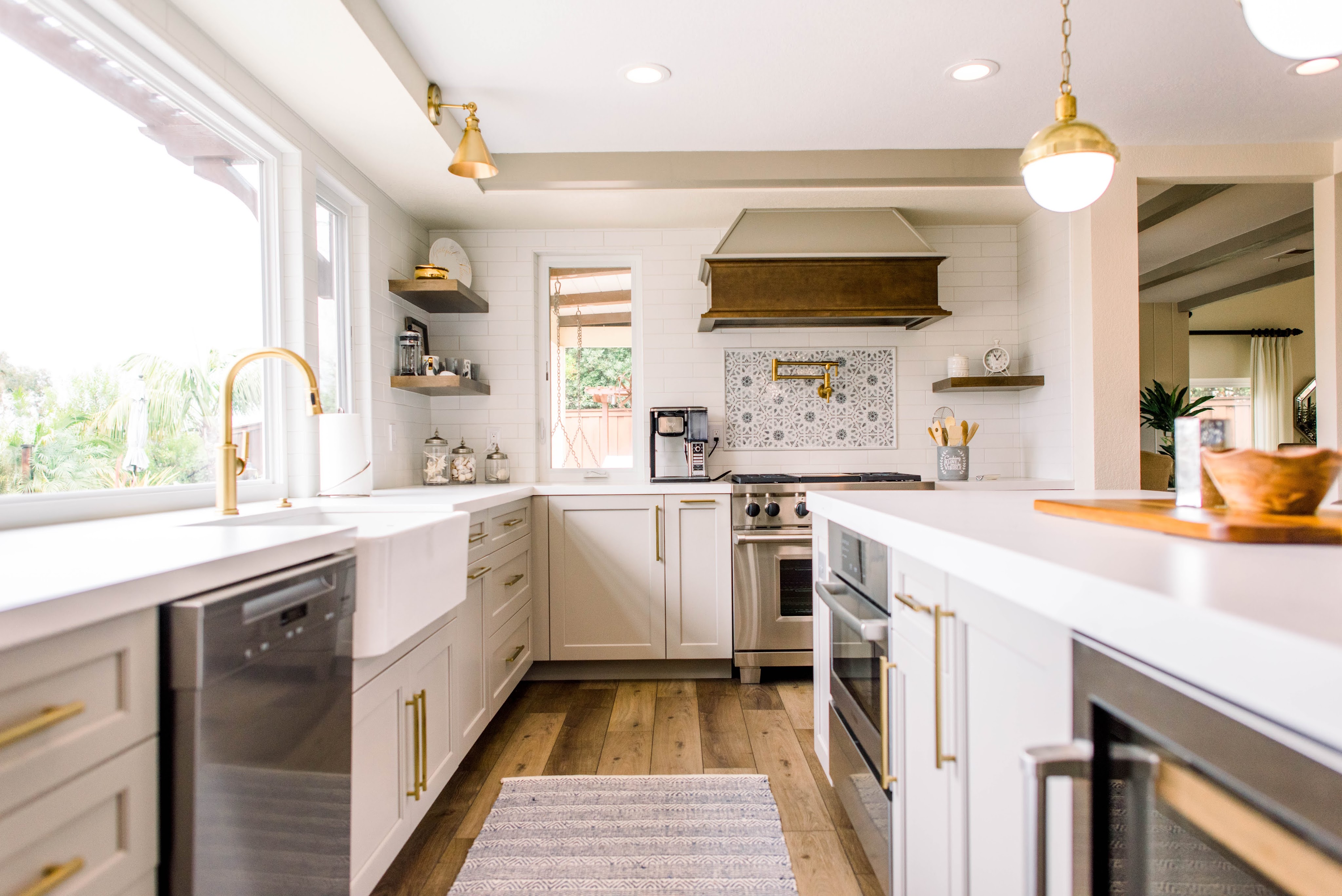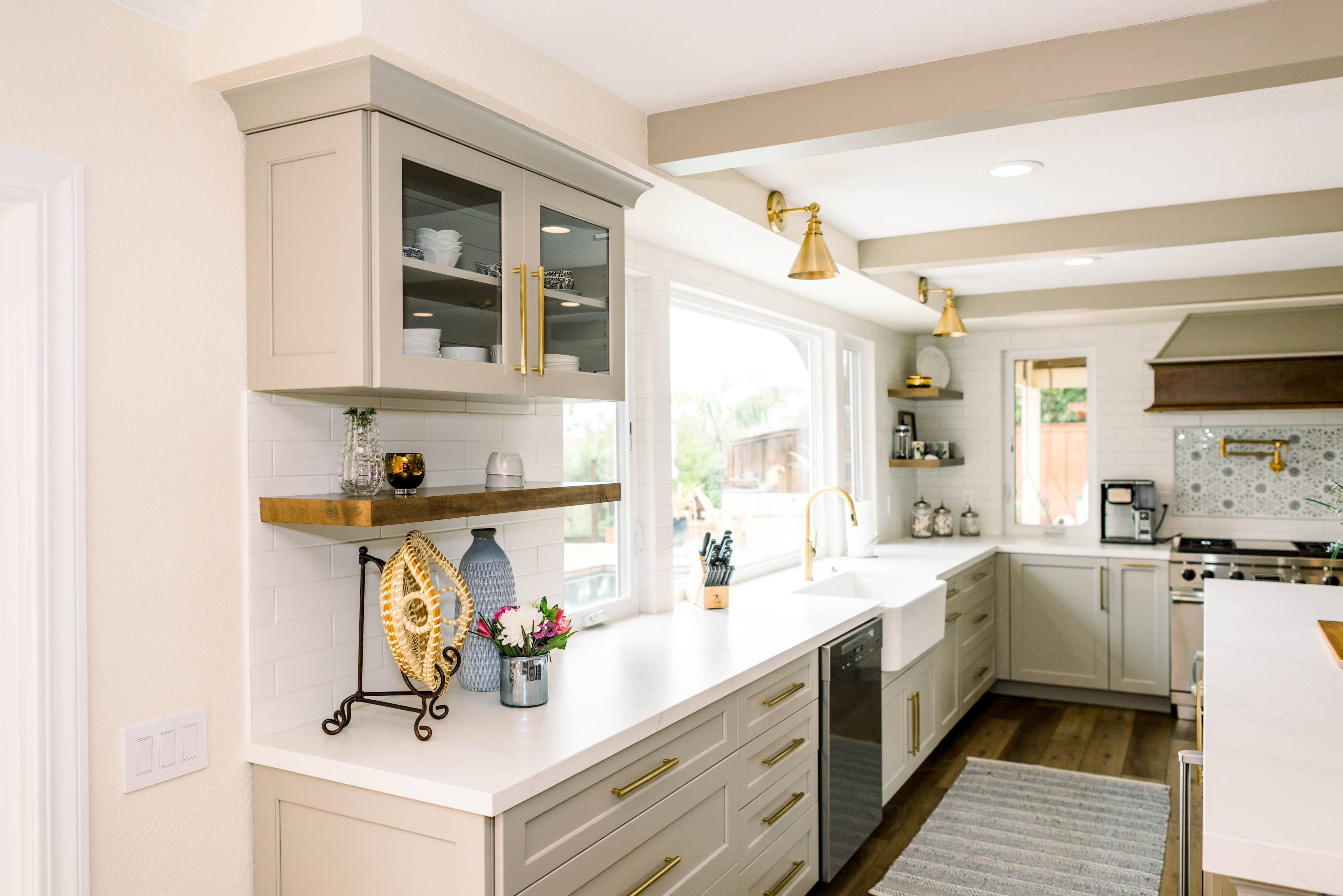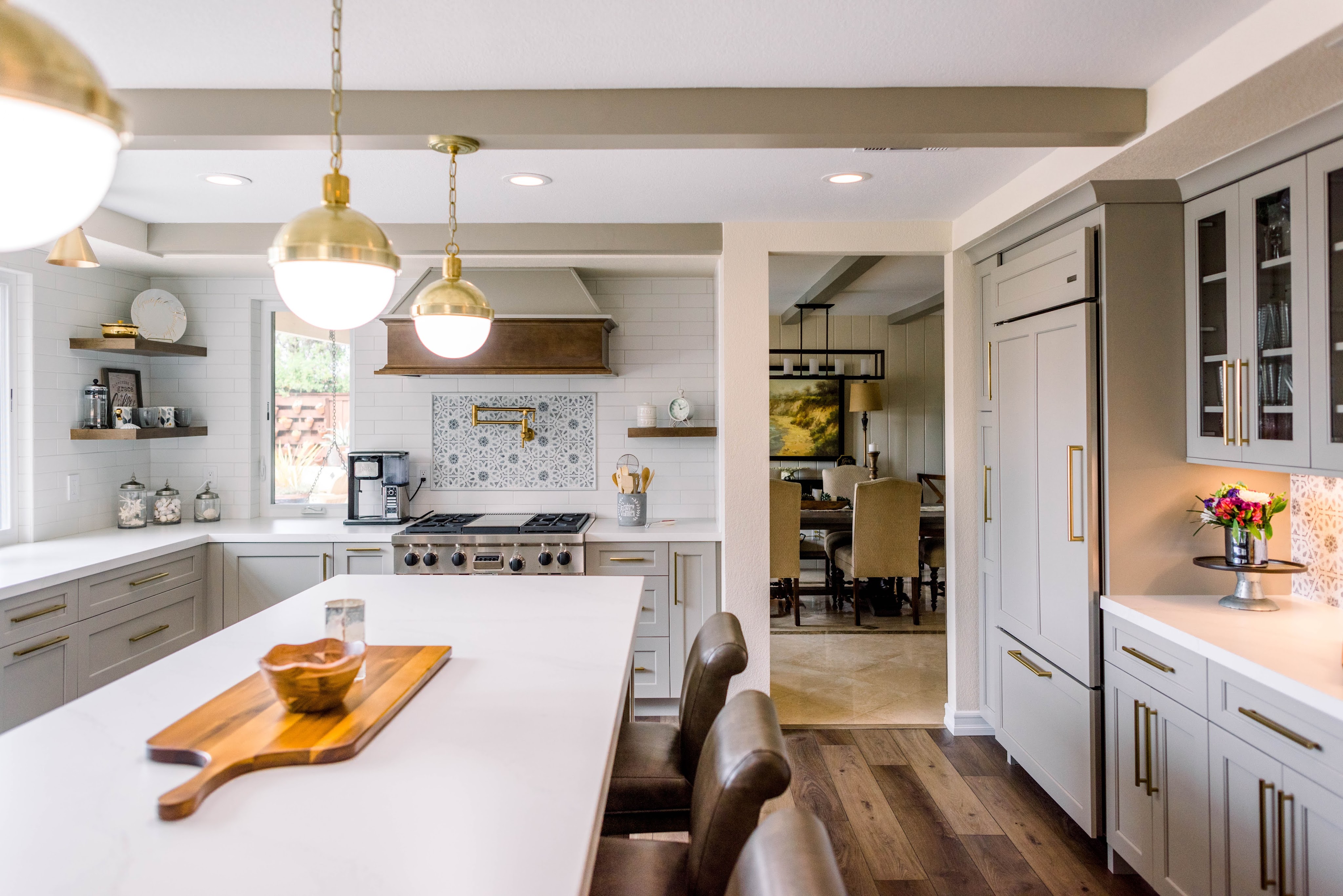 In this fabulous kitchen remodel, and home update, Design Craft cabinets were used, with Irish Creme paint and Eagle Rock stained wood accents. Cosentino Calacatta Gold quartz countertops provide a easy to clean and maintain surface. Honey Bronze hardware and plumbing finishes provide a unique golden accent to this coastal home. New, wider windows provide a previously unutilized view of the ocean.