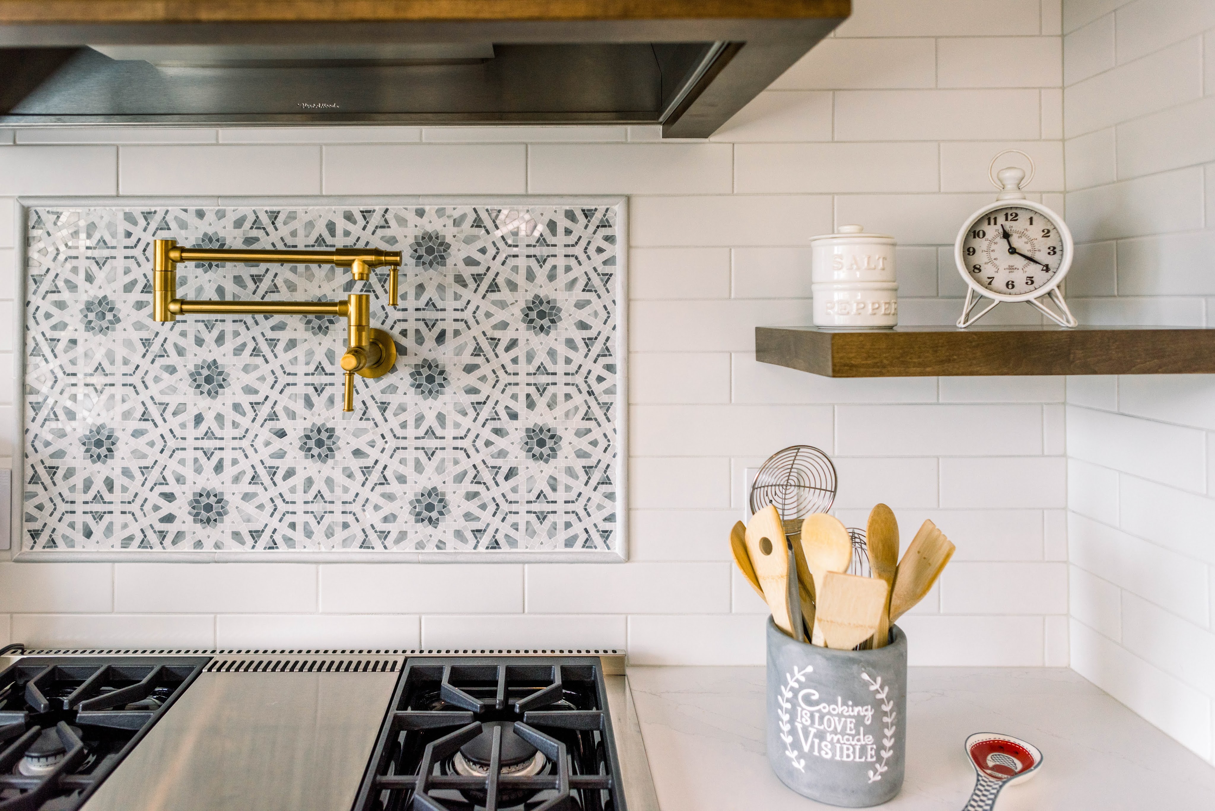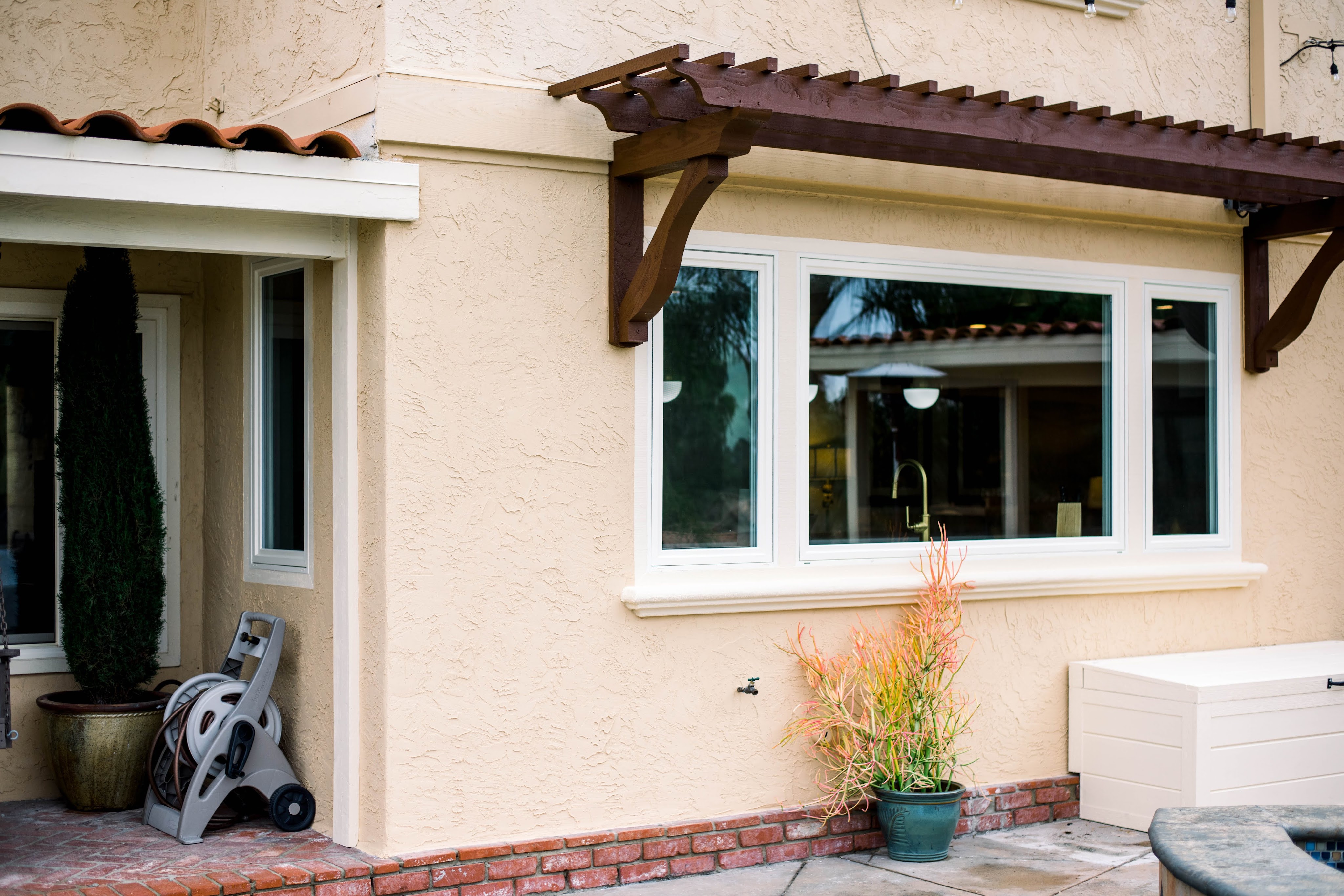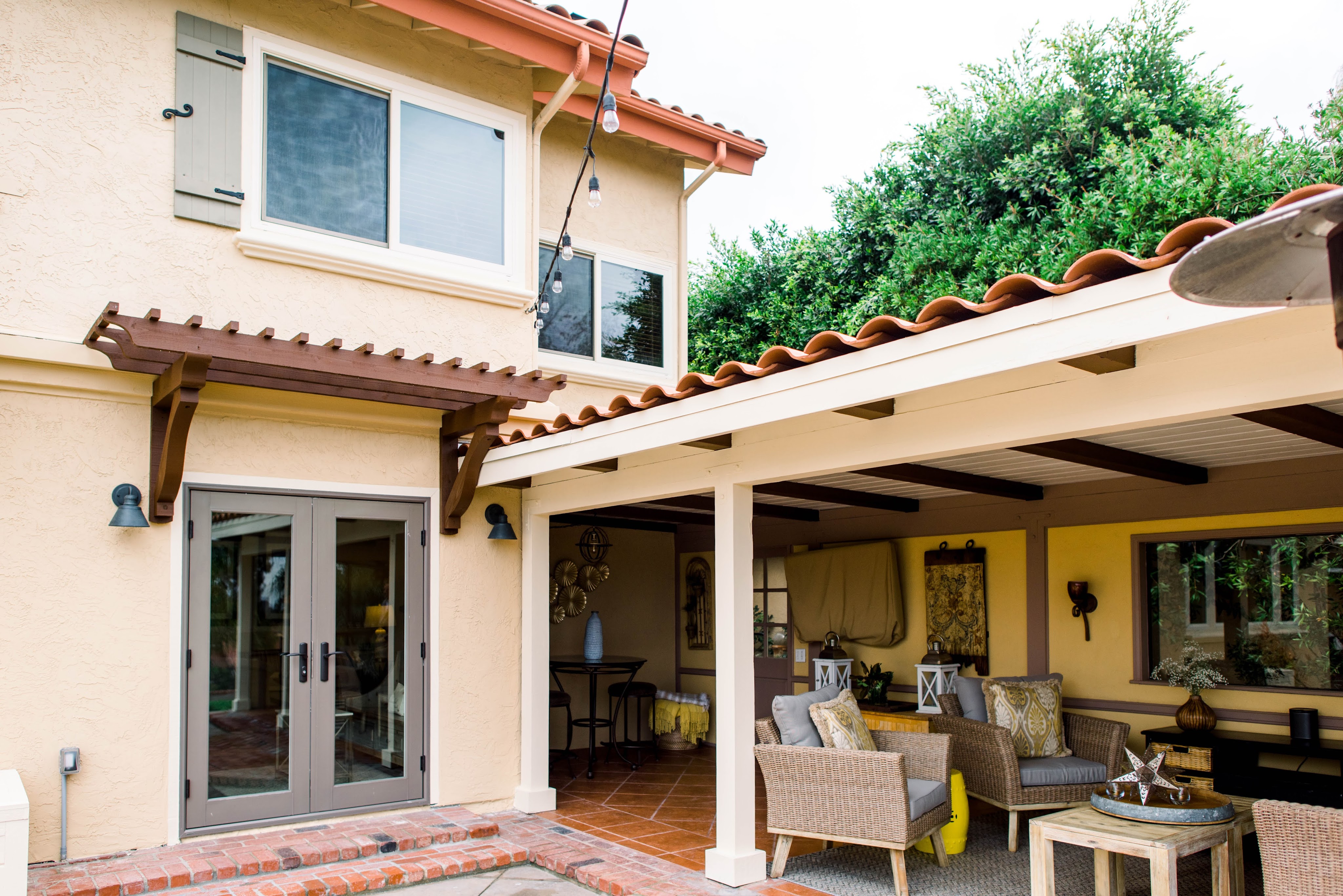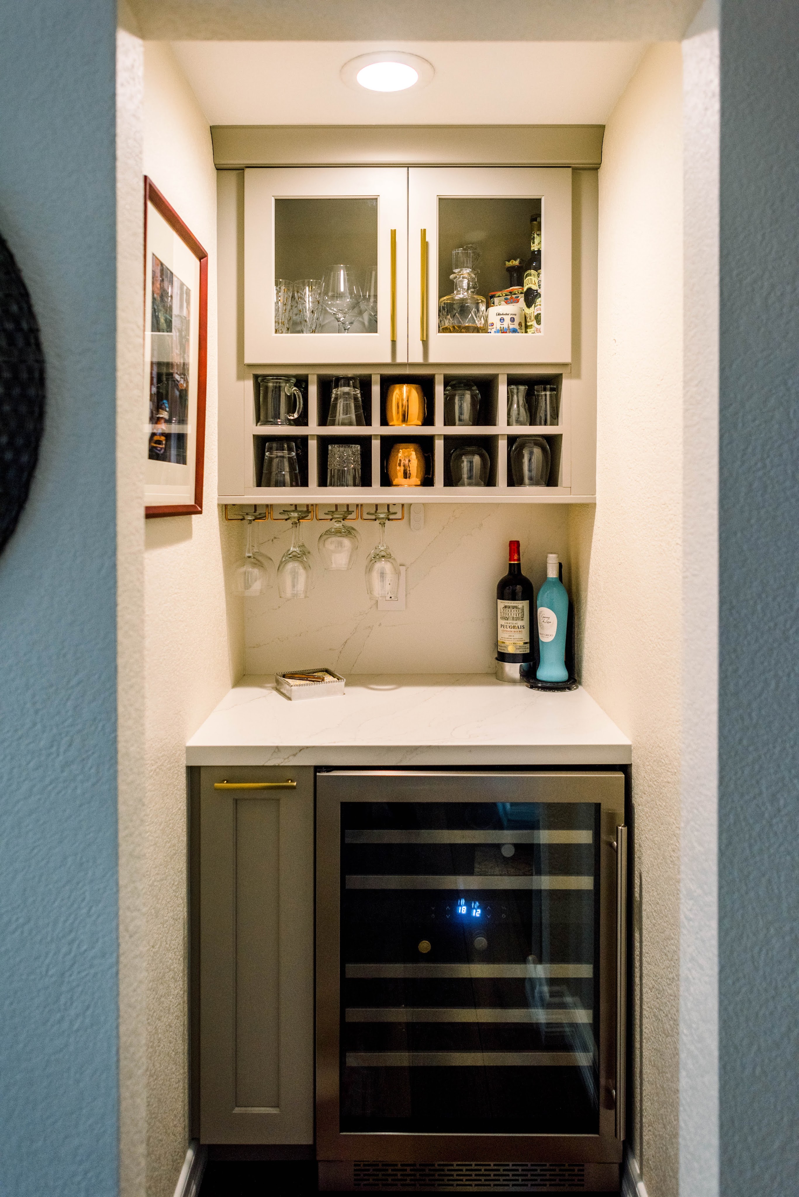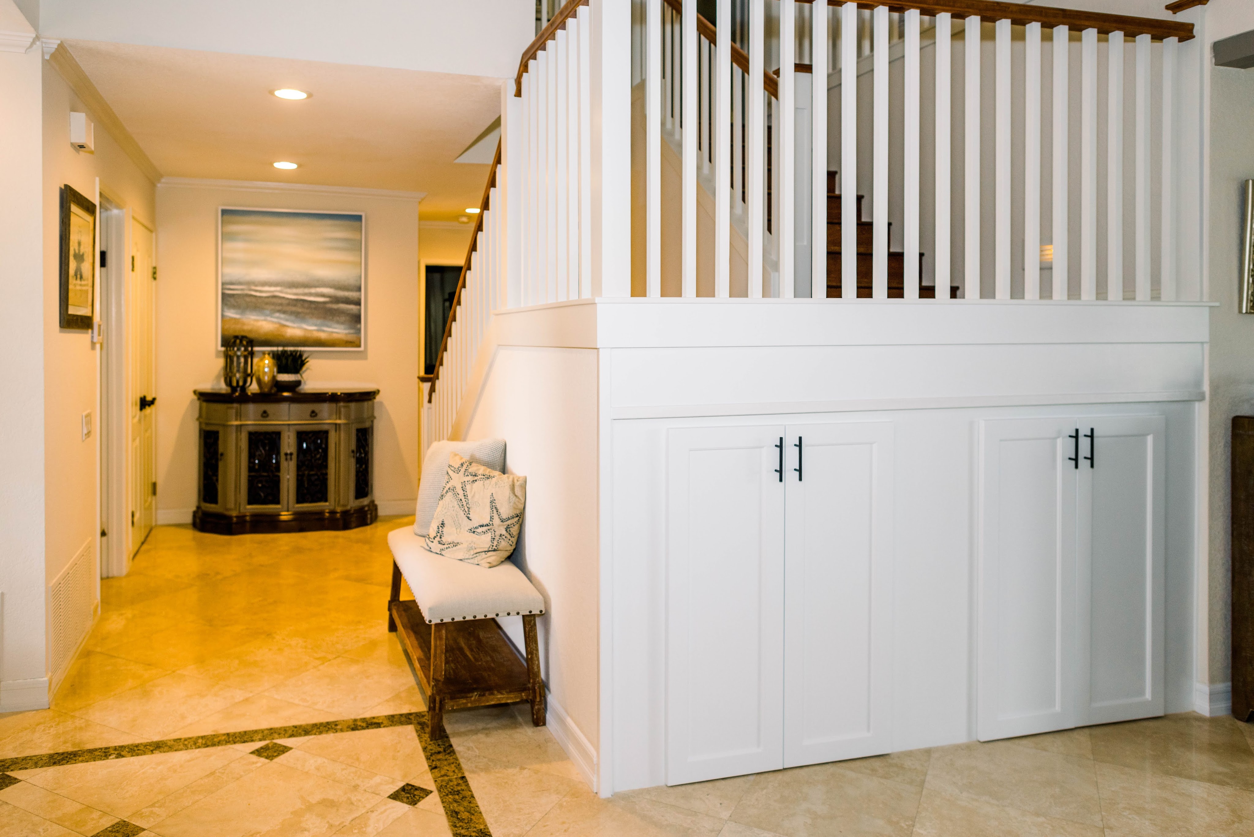 In this fabulous kitchen remodel, and home update, Design Craft cabinets were used, with Irish Creme paint and Eagle Rock stained wood accents. Cosentino Calacatta Gold quartz countertops provide a easy to clean and maintain surface. Honey Bronze hardware and plumbing finishes provide a unique golden accent to this coastal home. New, wider windows provide a previously unutilized view of the ocean.