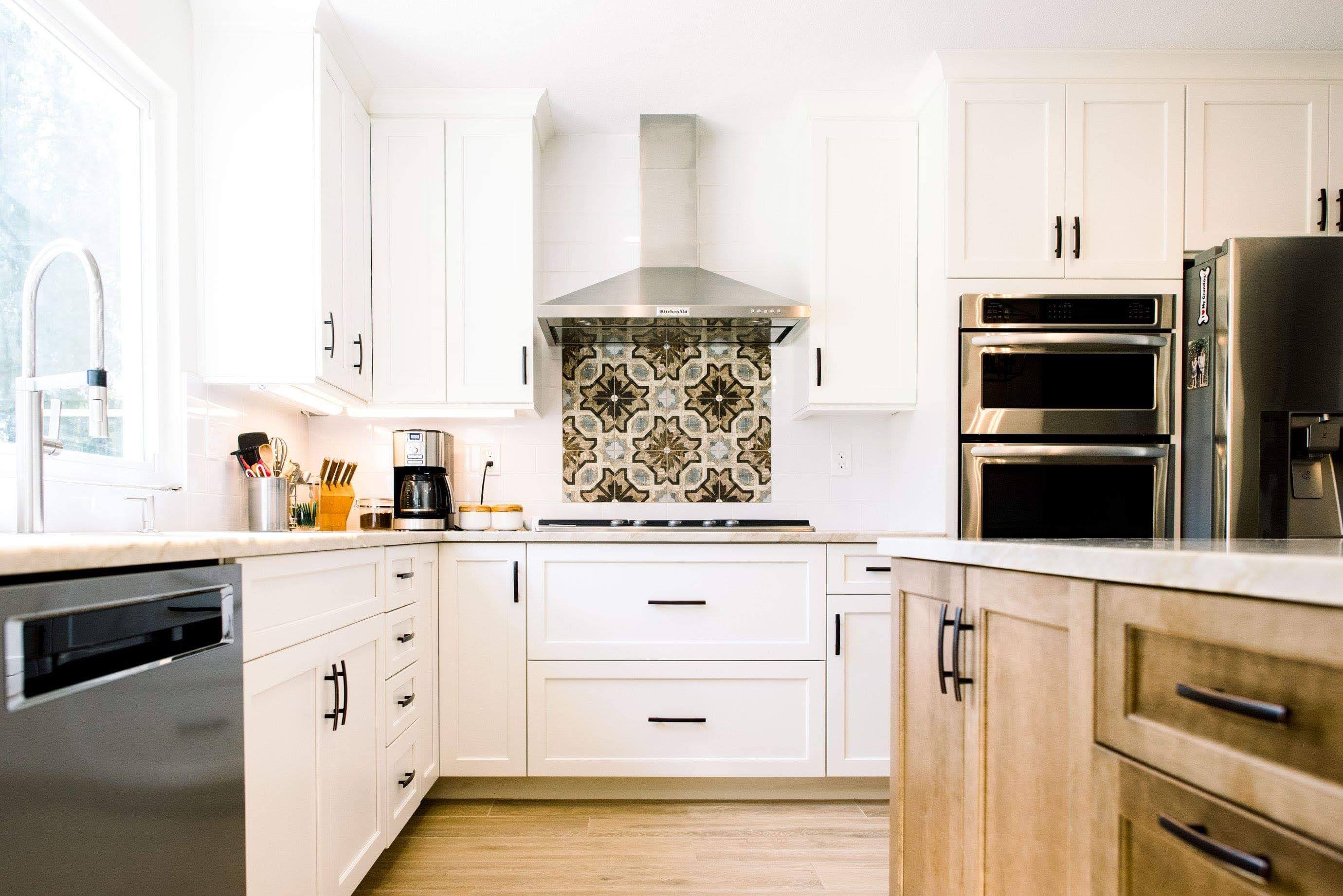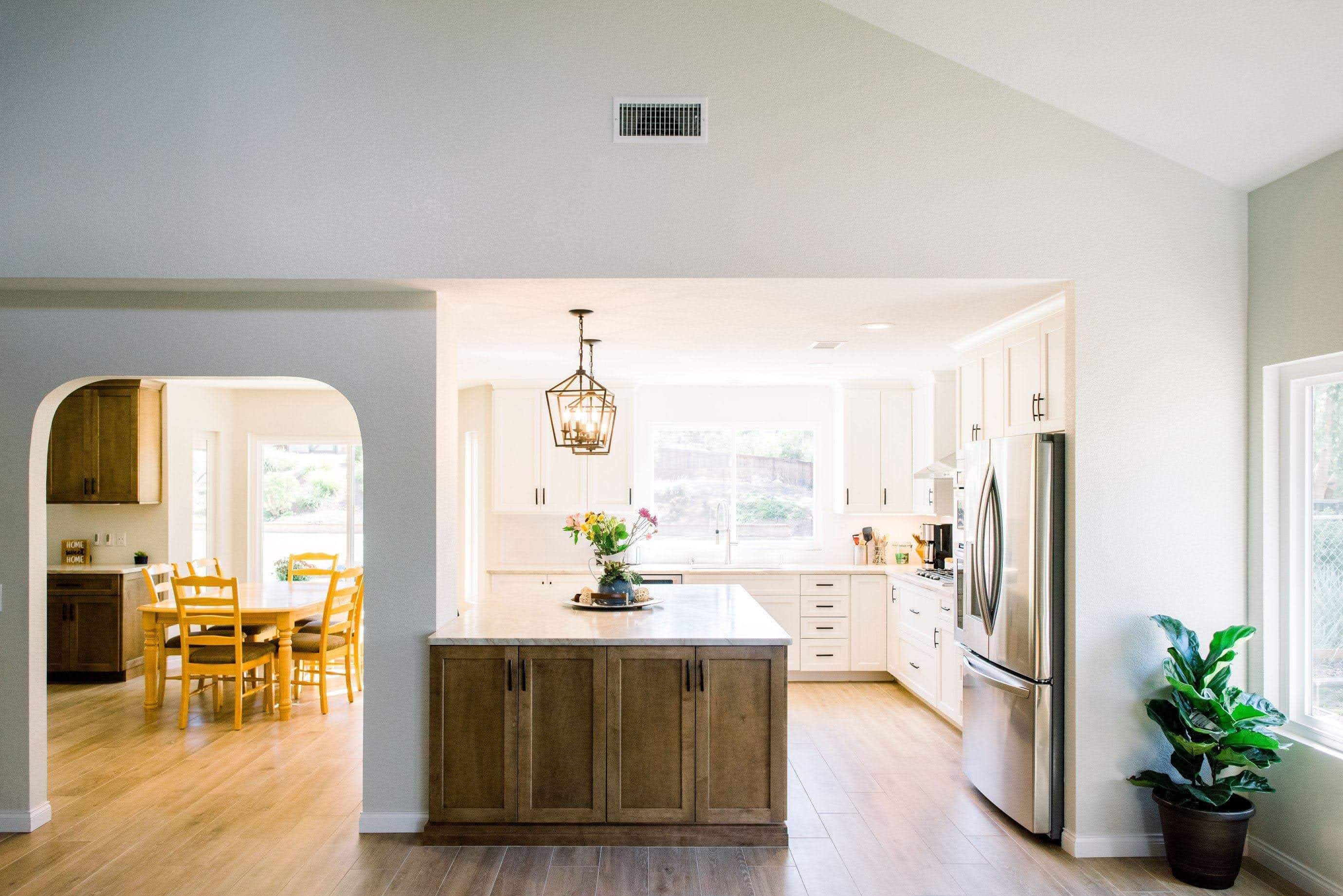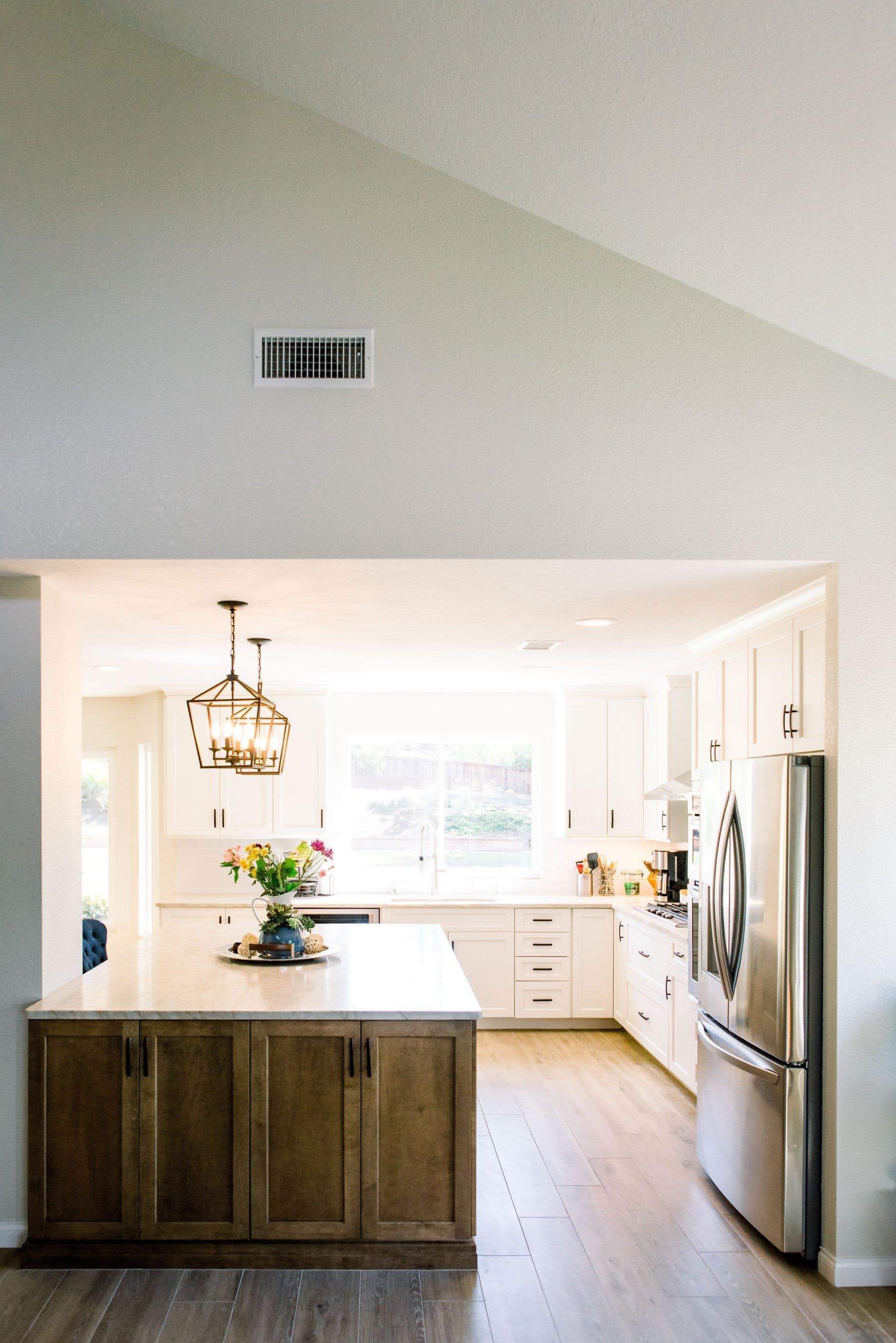 The goal for this design was to open up the kitchen to the living room. Removing the column was cost prohibitive, so a design that implemented the column as part of the island was necessary. Natural slab countertops became a requirement to cover the large island cabinetry. With the space open, the medium stain Eagle Rock, helps create bold a focus for the design. Although mostly hidden from the front, the accent tile provides another focal point to the new space.