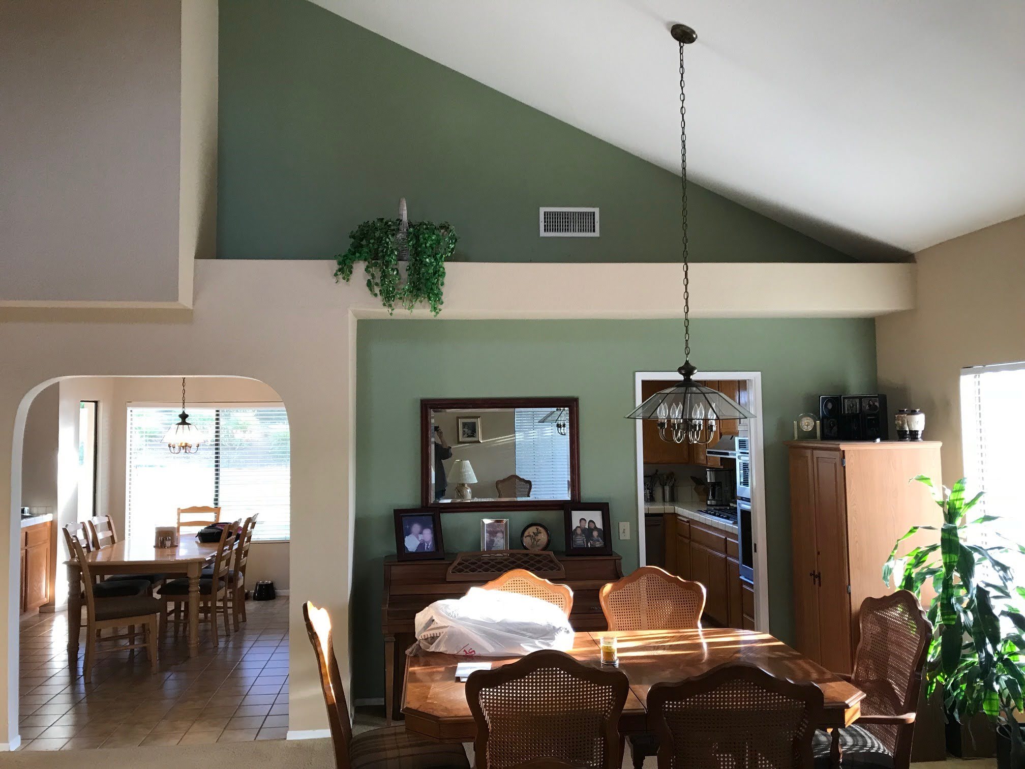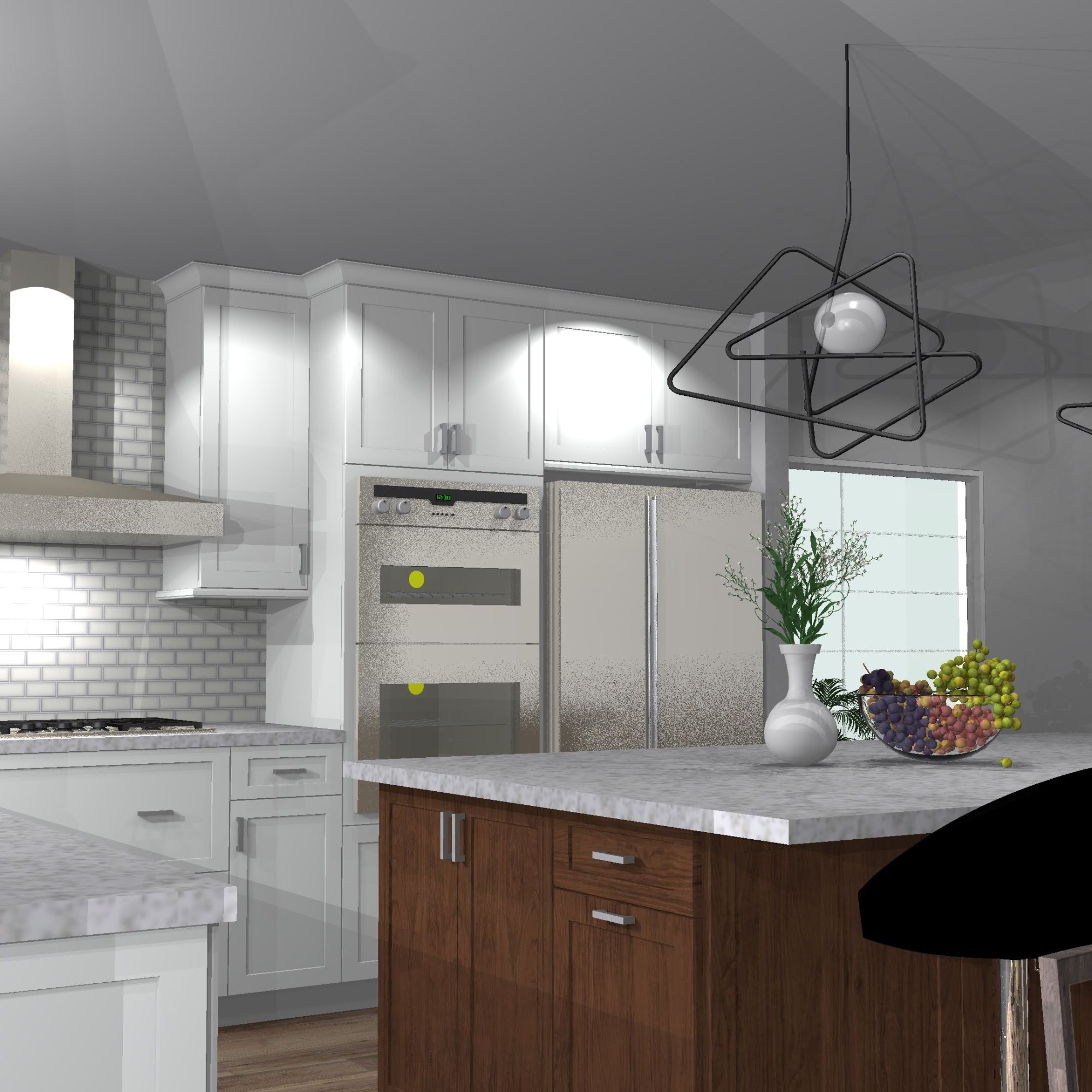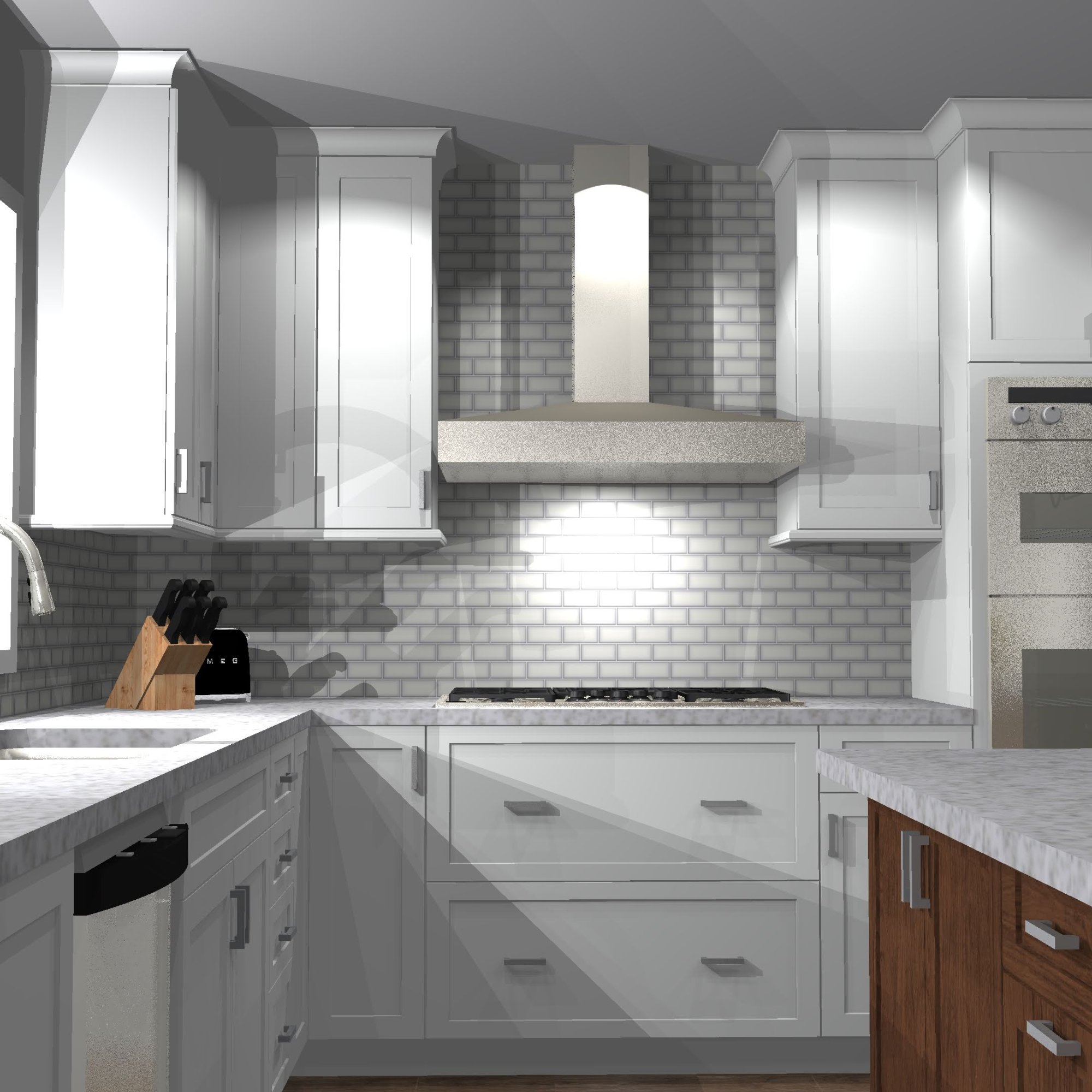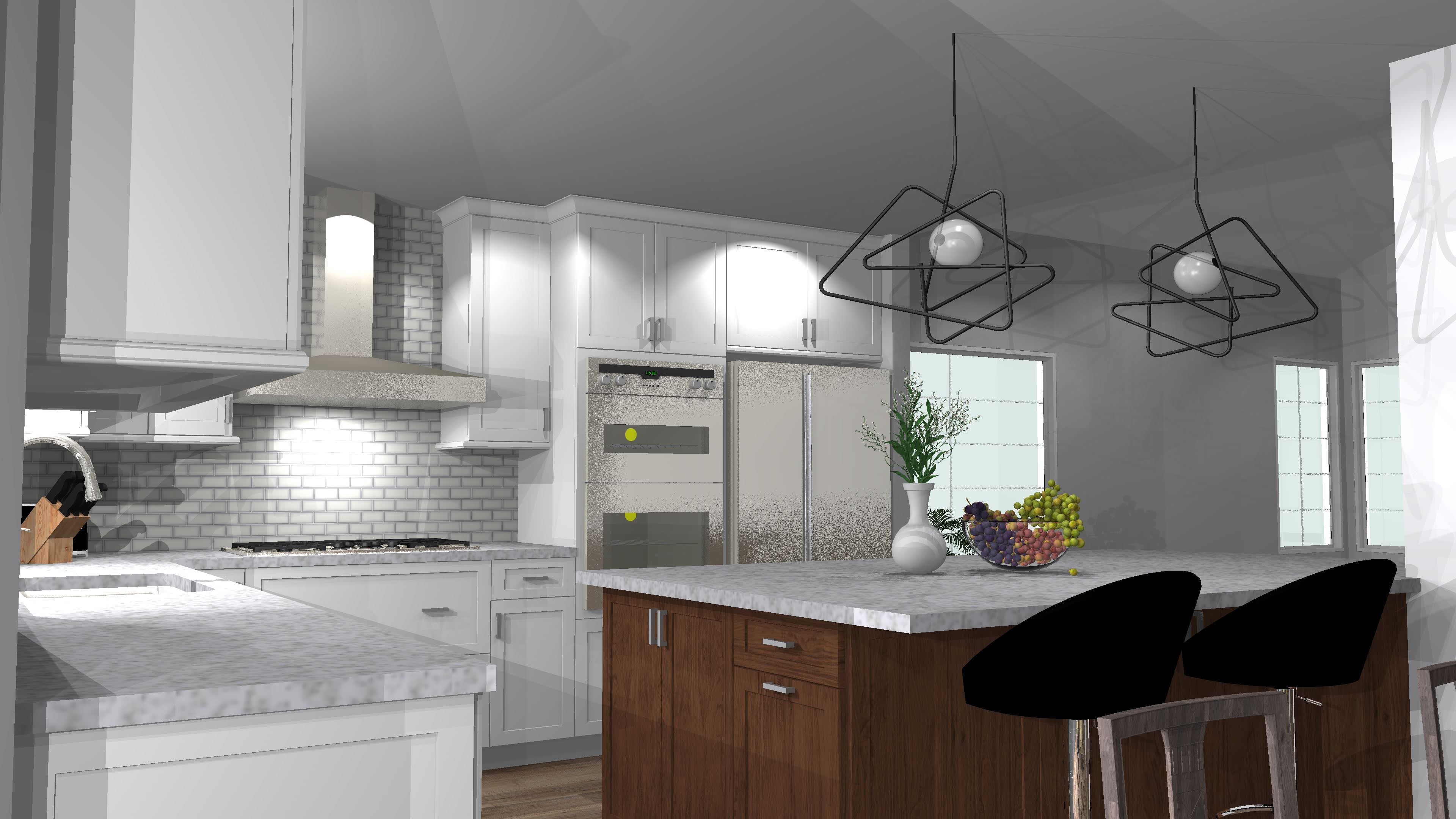 The goal for this design was to open up the kitchen to the living room. Removing the column was cost prohibitive, so a design that implemented the column as part of the island was necessary. Natural slab countertops became a requirement to cover the large island cabinetry. With the space open, the medium stain Eagle Rock, helps create bold a focus for the design. Although mostly hidden from the front, the accent tile provides another focal point to the new space.