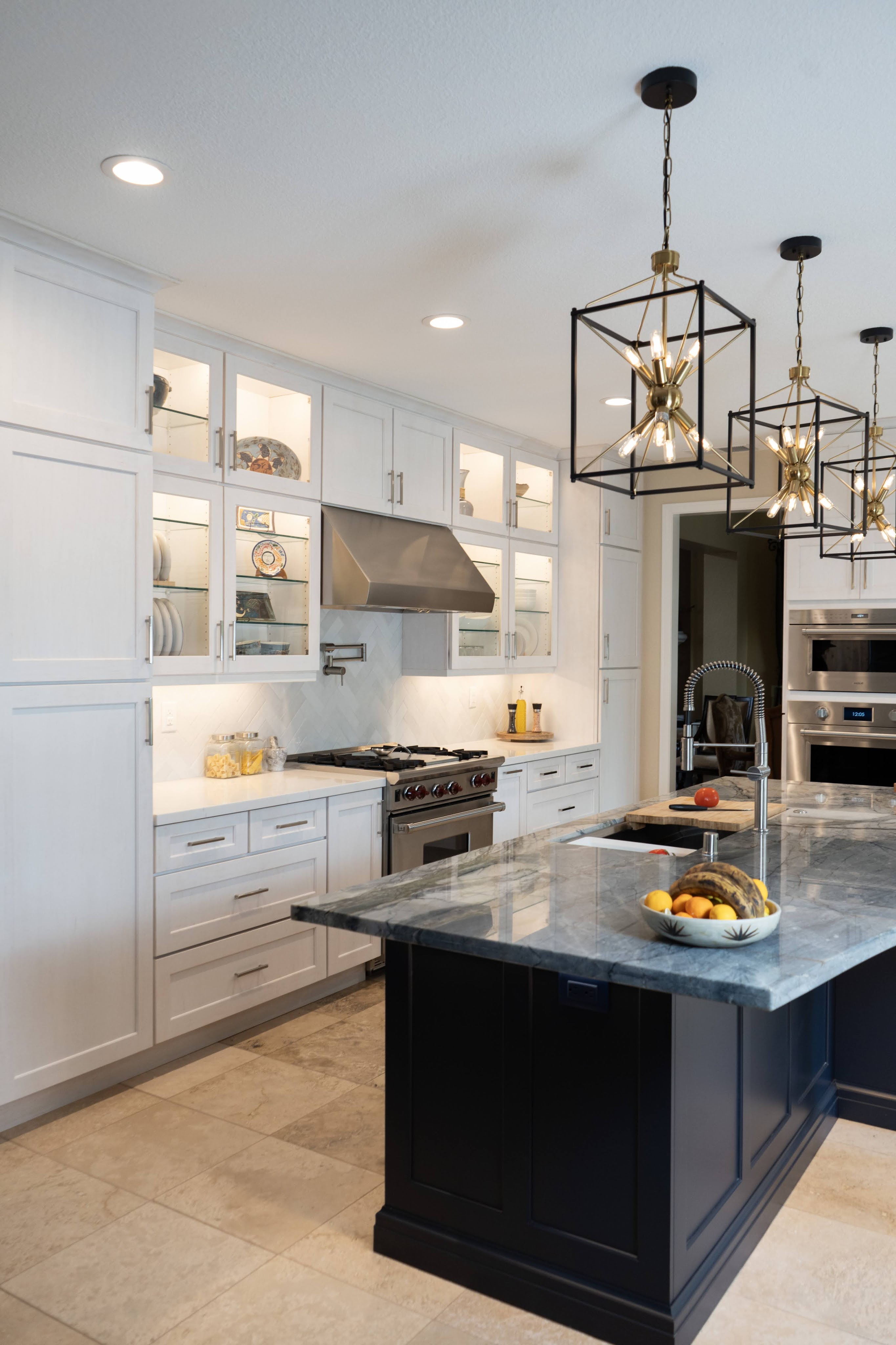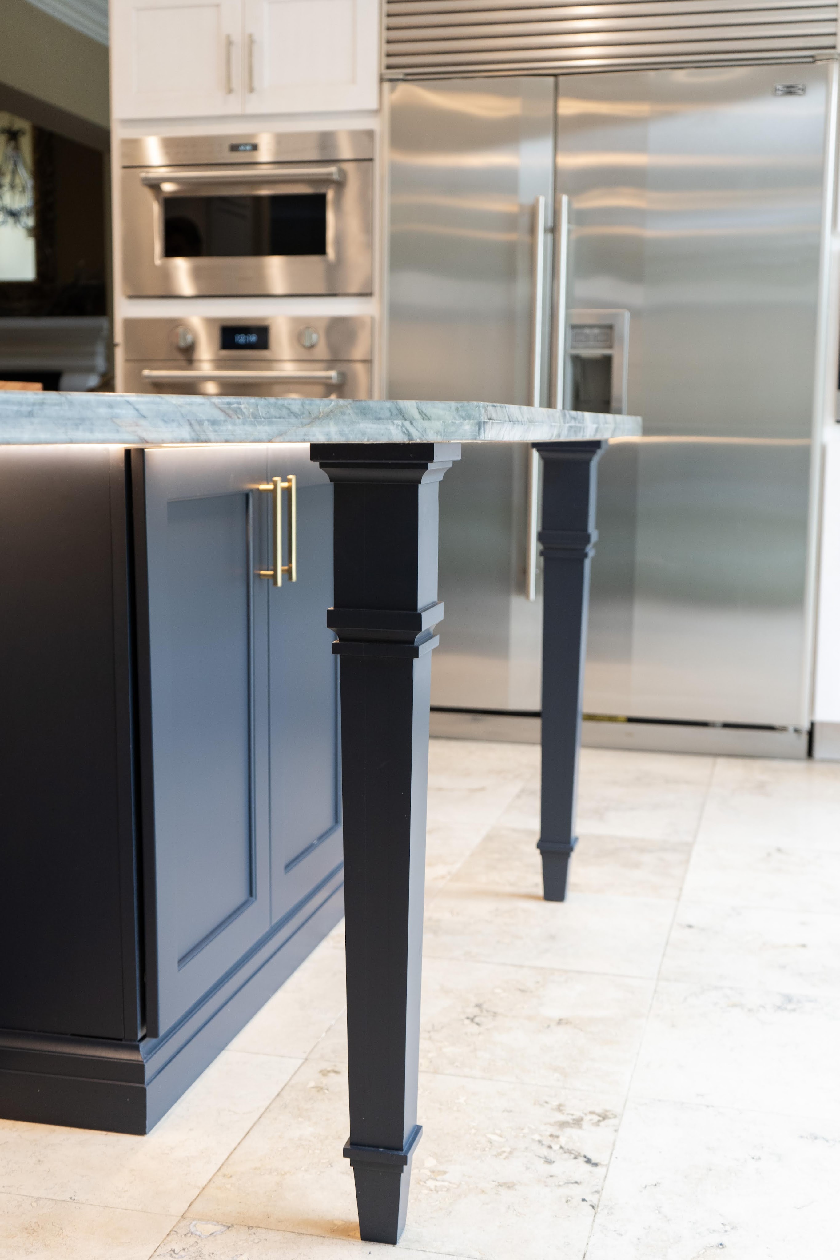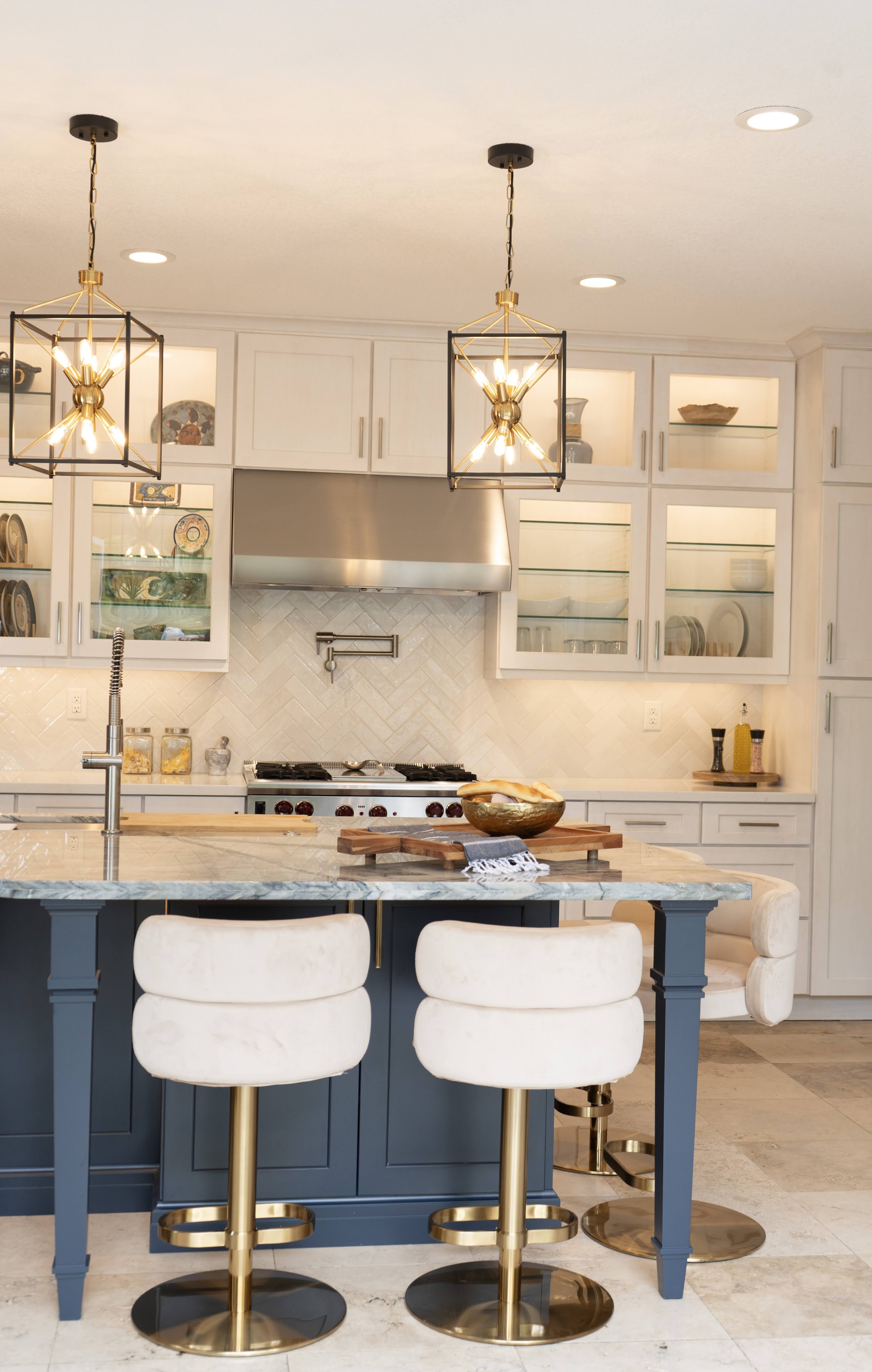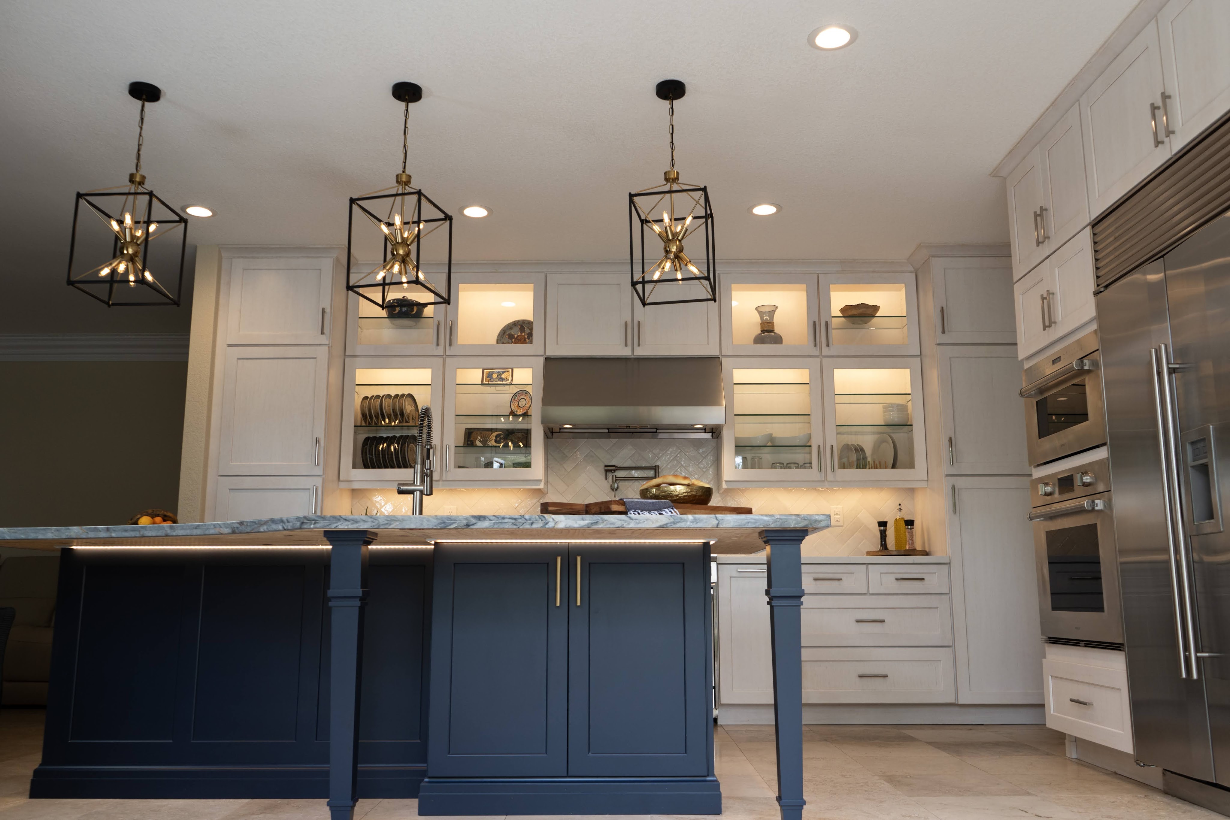 This project utilizes Design Craft cabinets, with a fantastic Celeste blue island, and dry brushed coastal surrounding cabinets. Beautiful natural slabs were used to maximize island size.