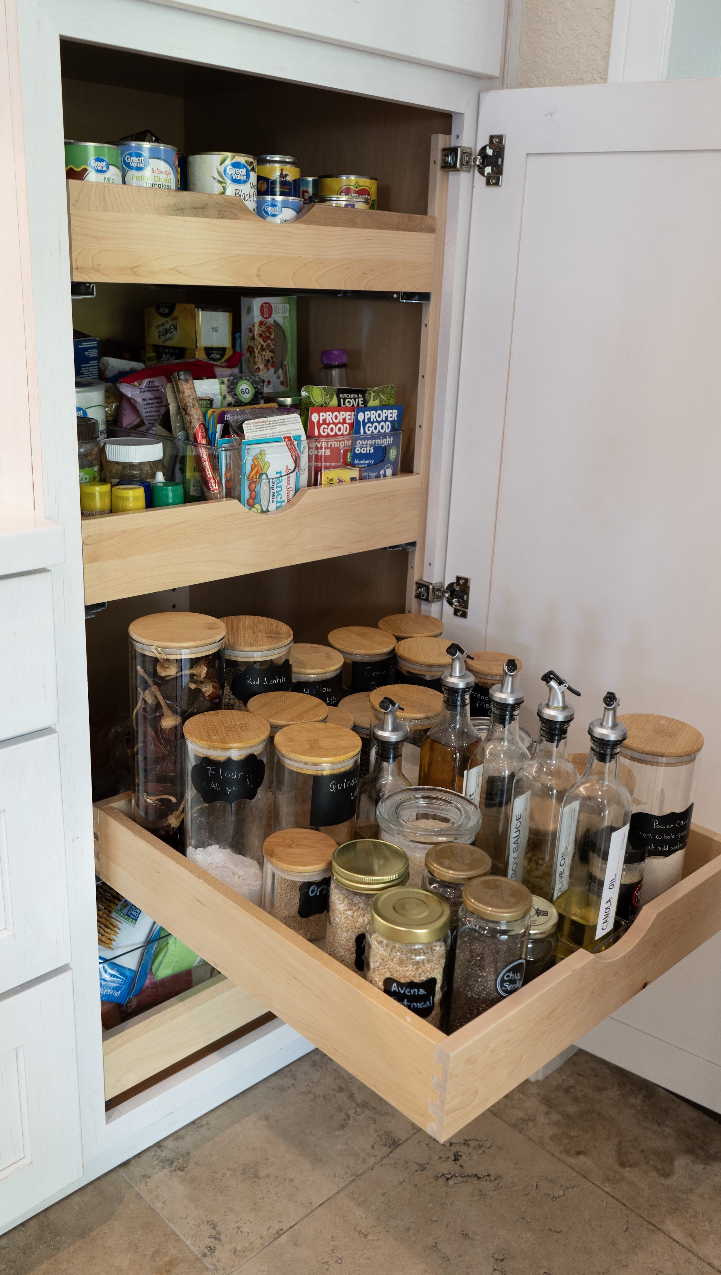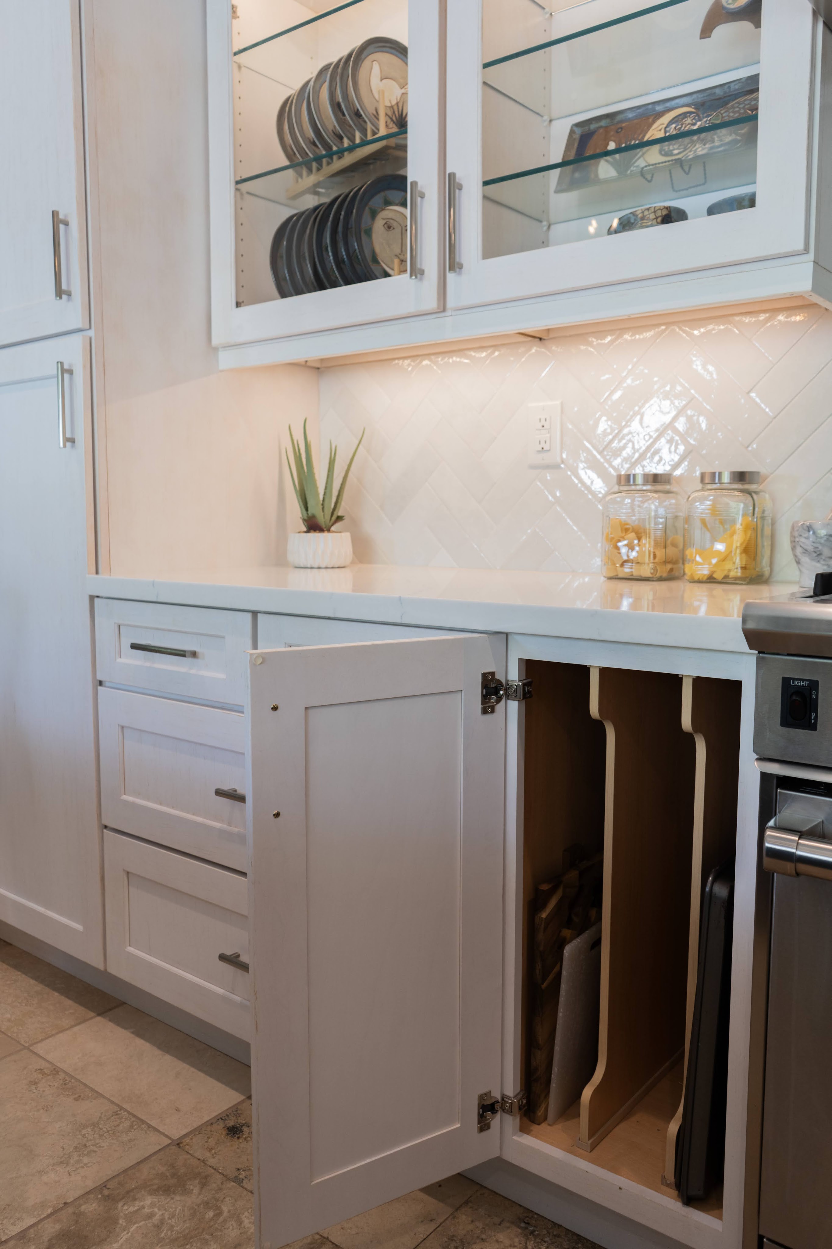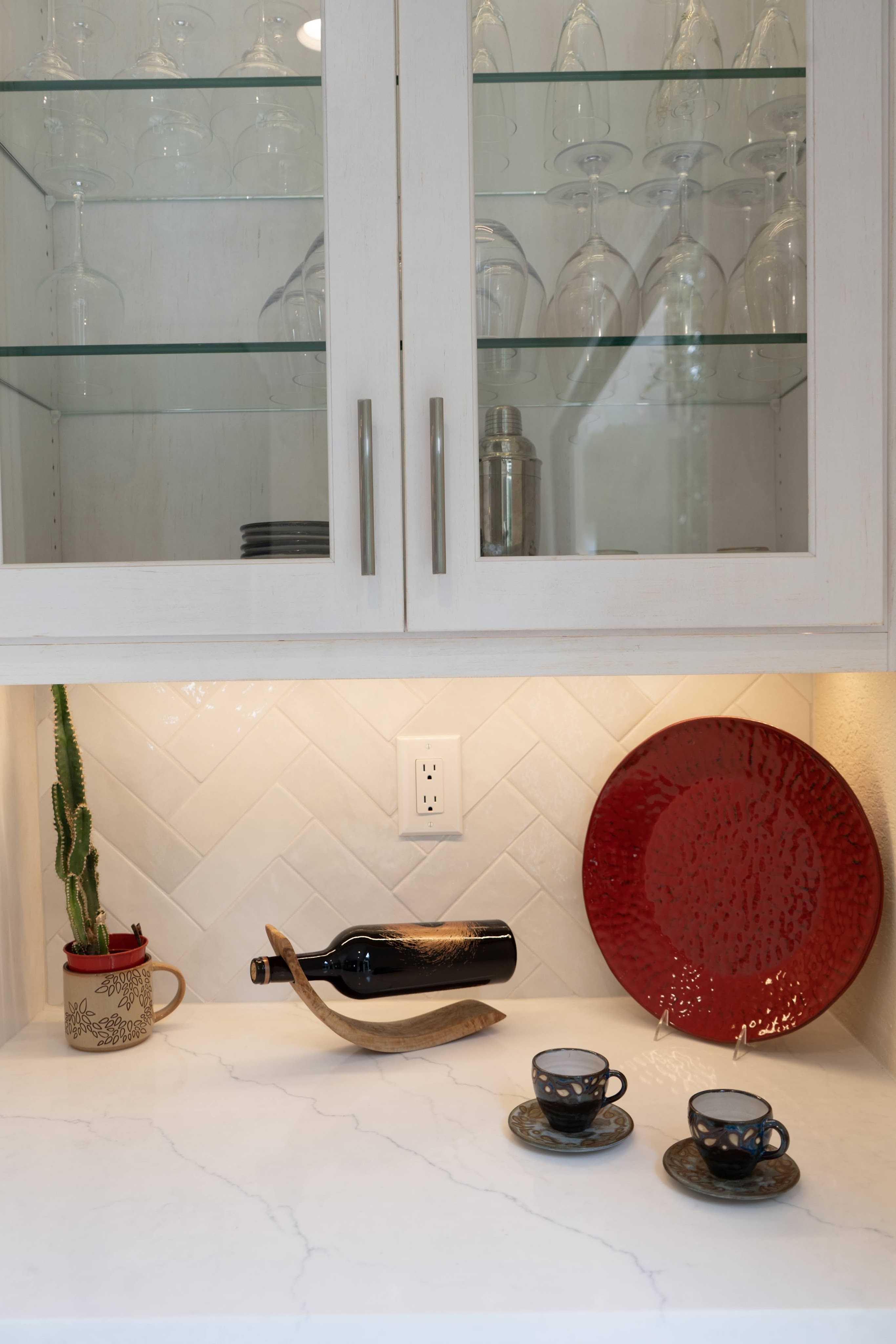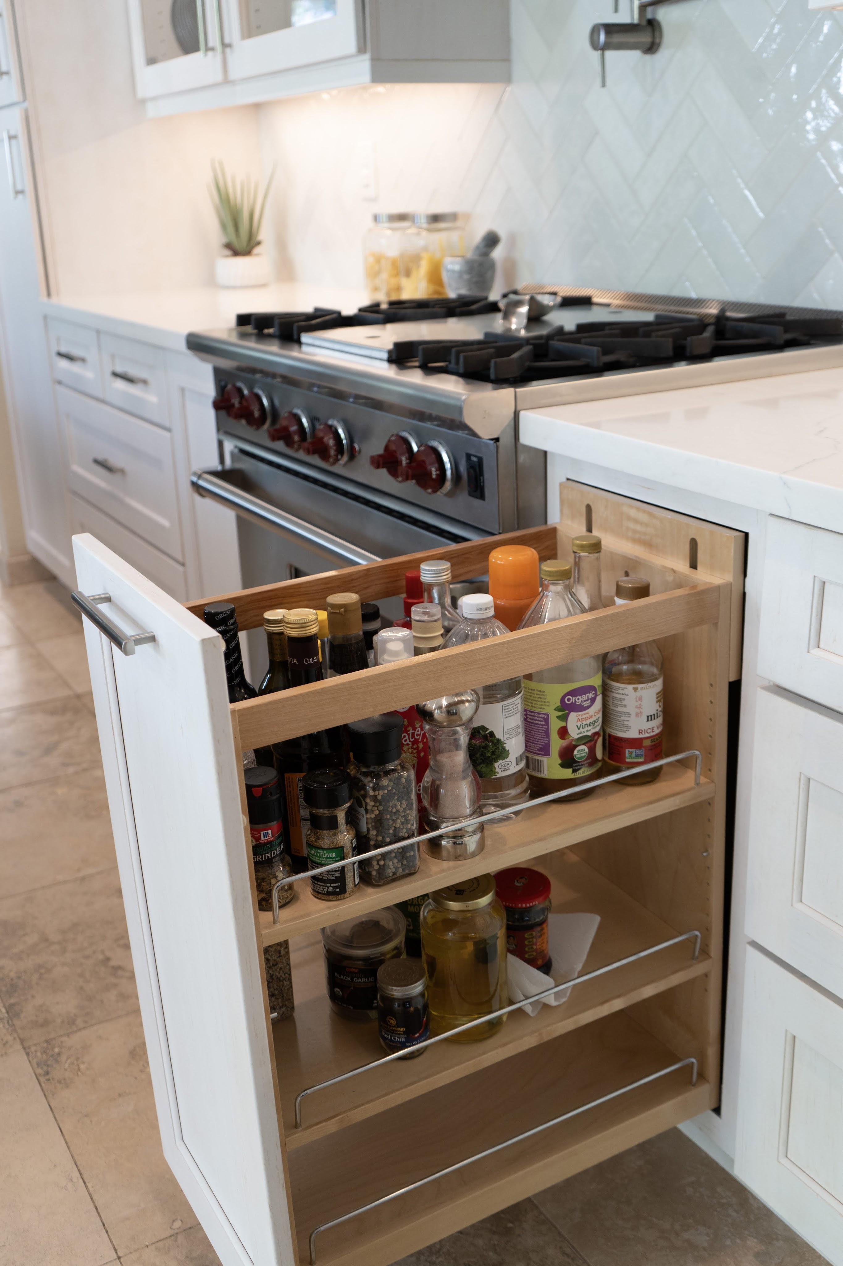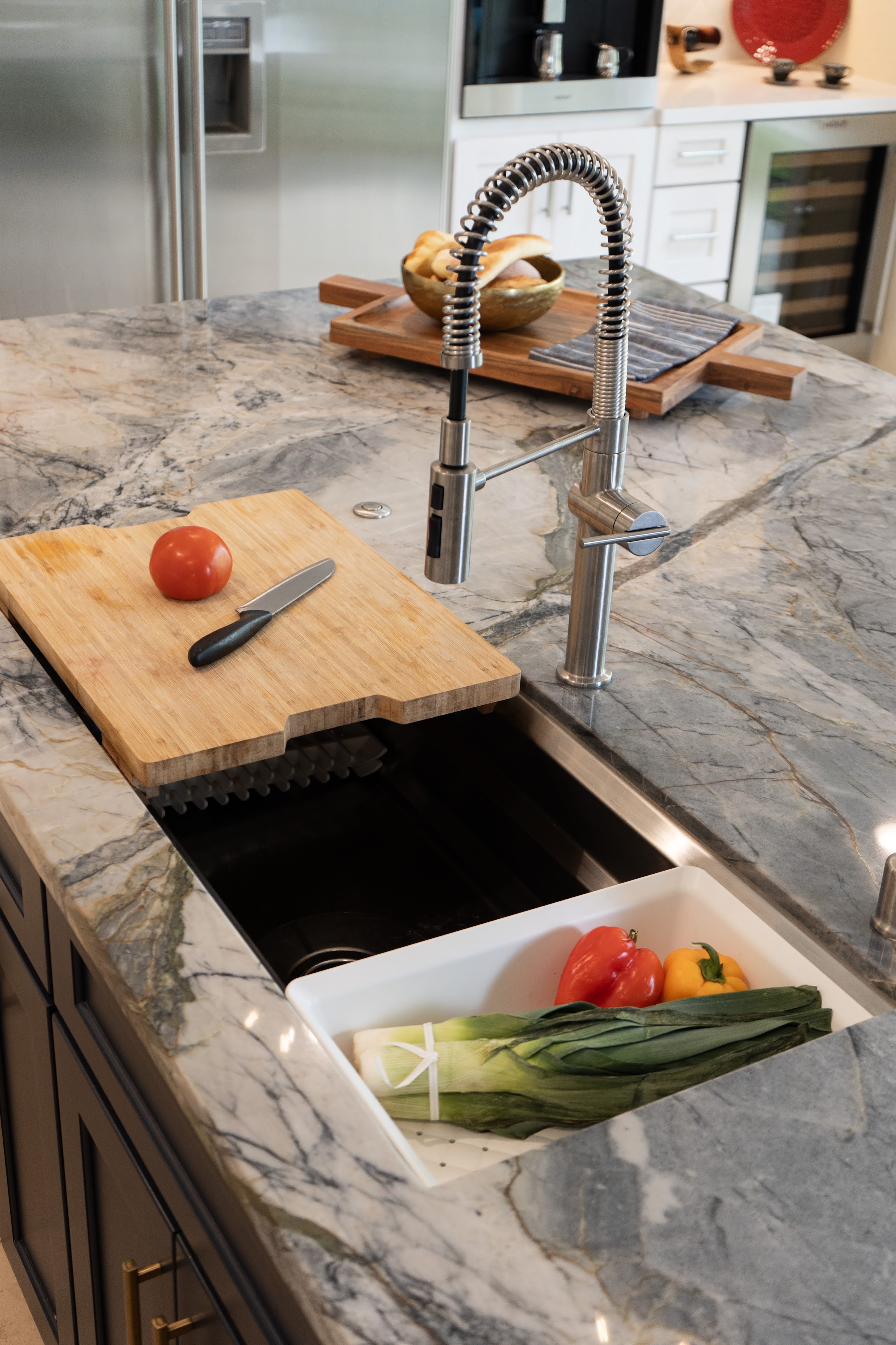 This project utilizes Design Craft cabinets, with a fantastic Celeste blue island, and dry brushed coastal surrounding cabinets. Beautiful natural slabs were used to maximize island size.