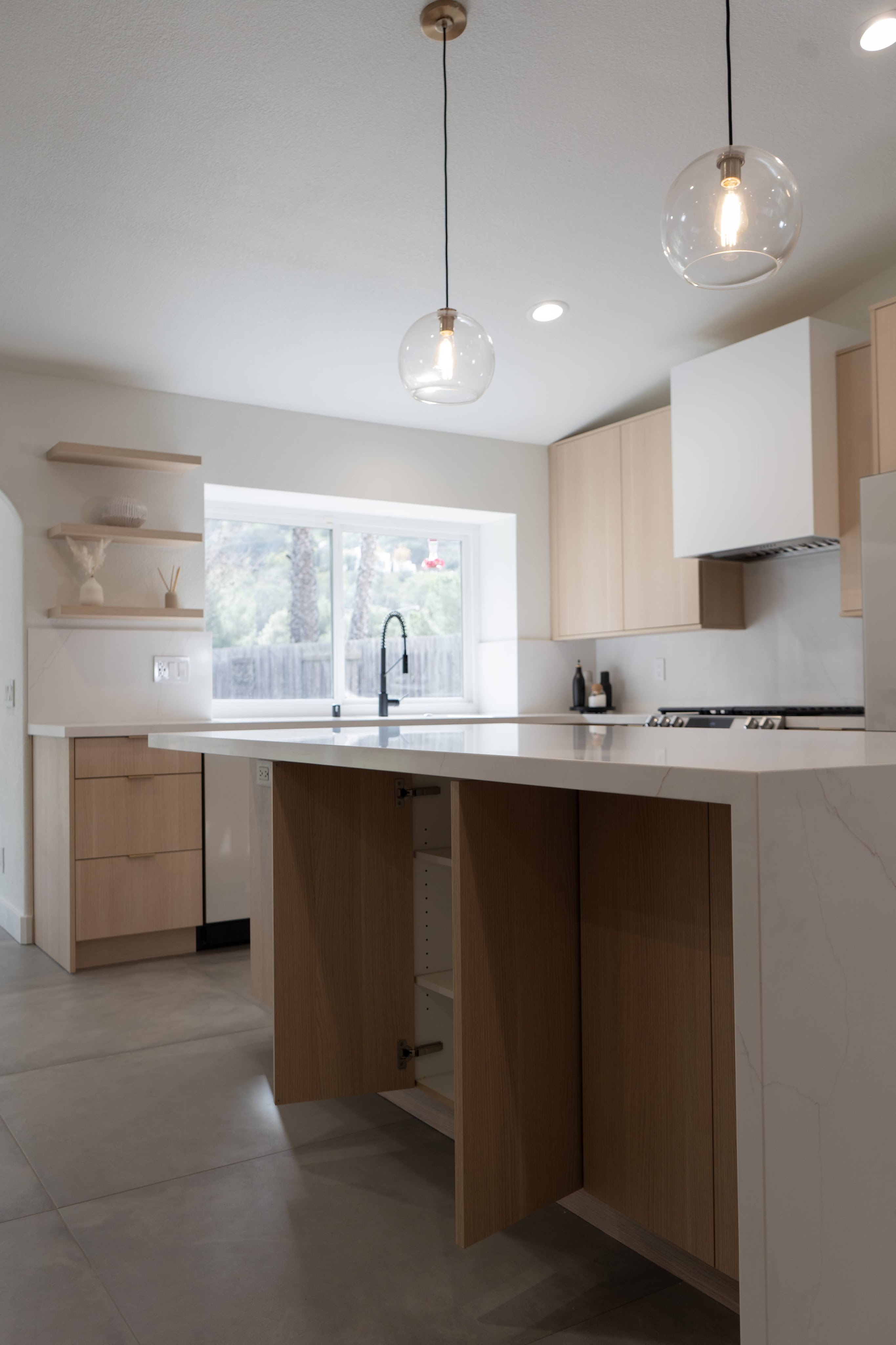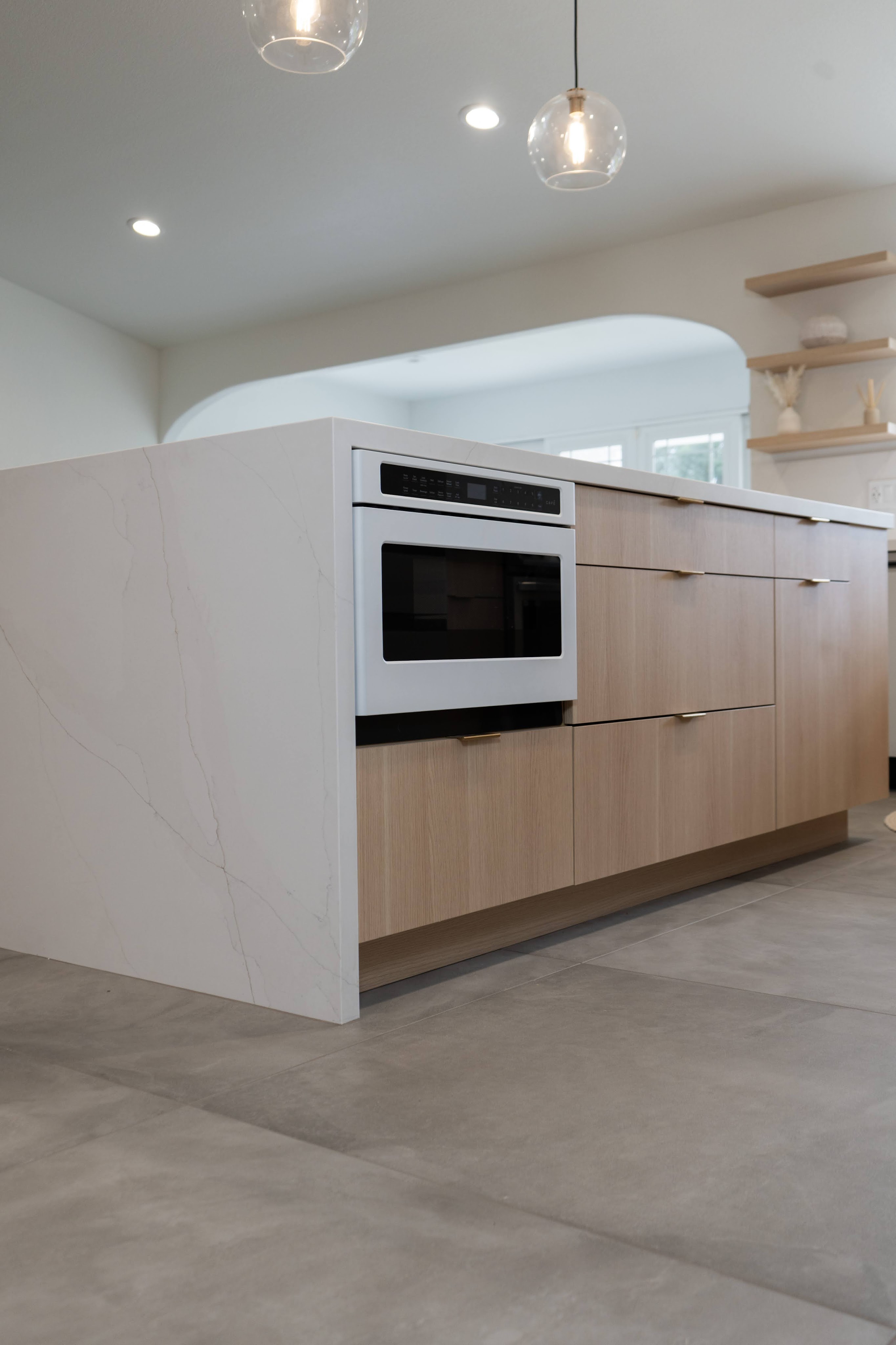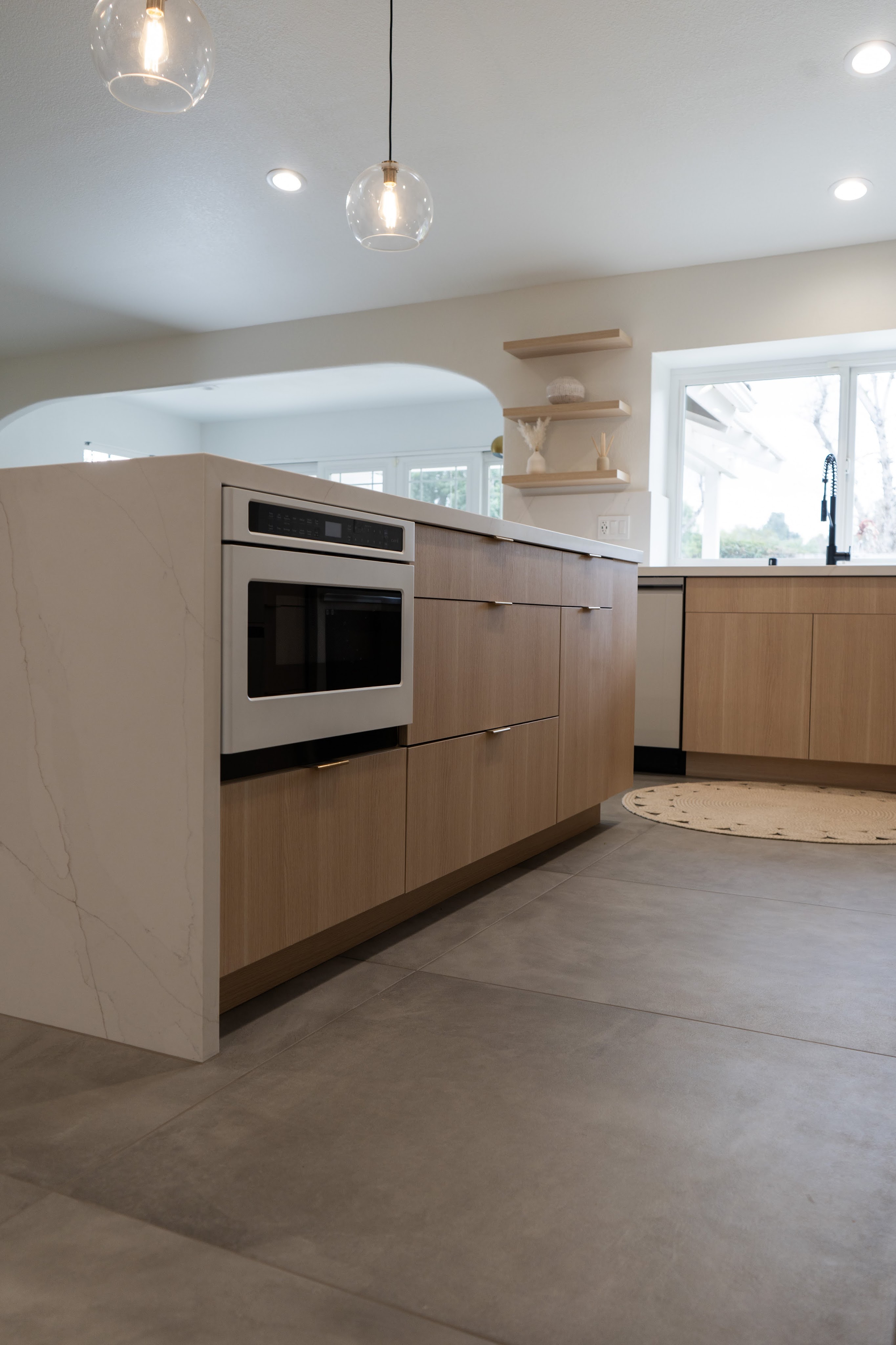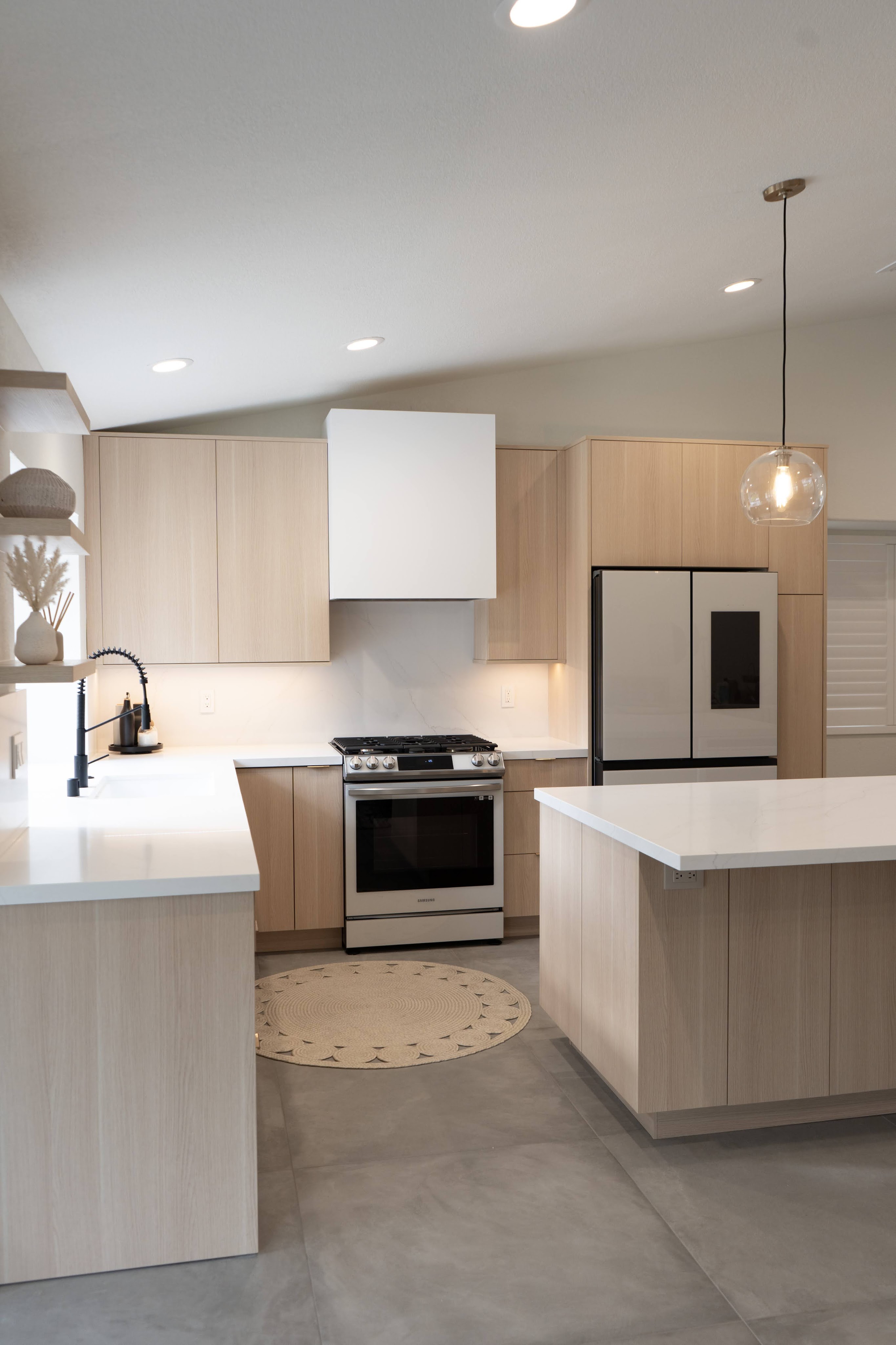 This spacious floor plan came to be after removing central walls and a fireplace that separated the kitchen, living room, and dining spaces. A revamped bathroom adds continuity to the home. Flat paneled, textured laminate, cabinets are durable and easy to clean while still providing a creamy taupe, luxury wood look. Floating shelves near the sink allow for display of keepsakes or easy access for commonly used dishes. A modern Samsung Bespoke refrigerator and range are easy to clean white glass.