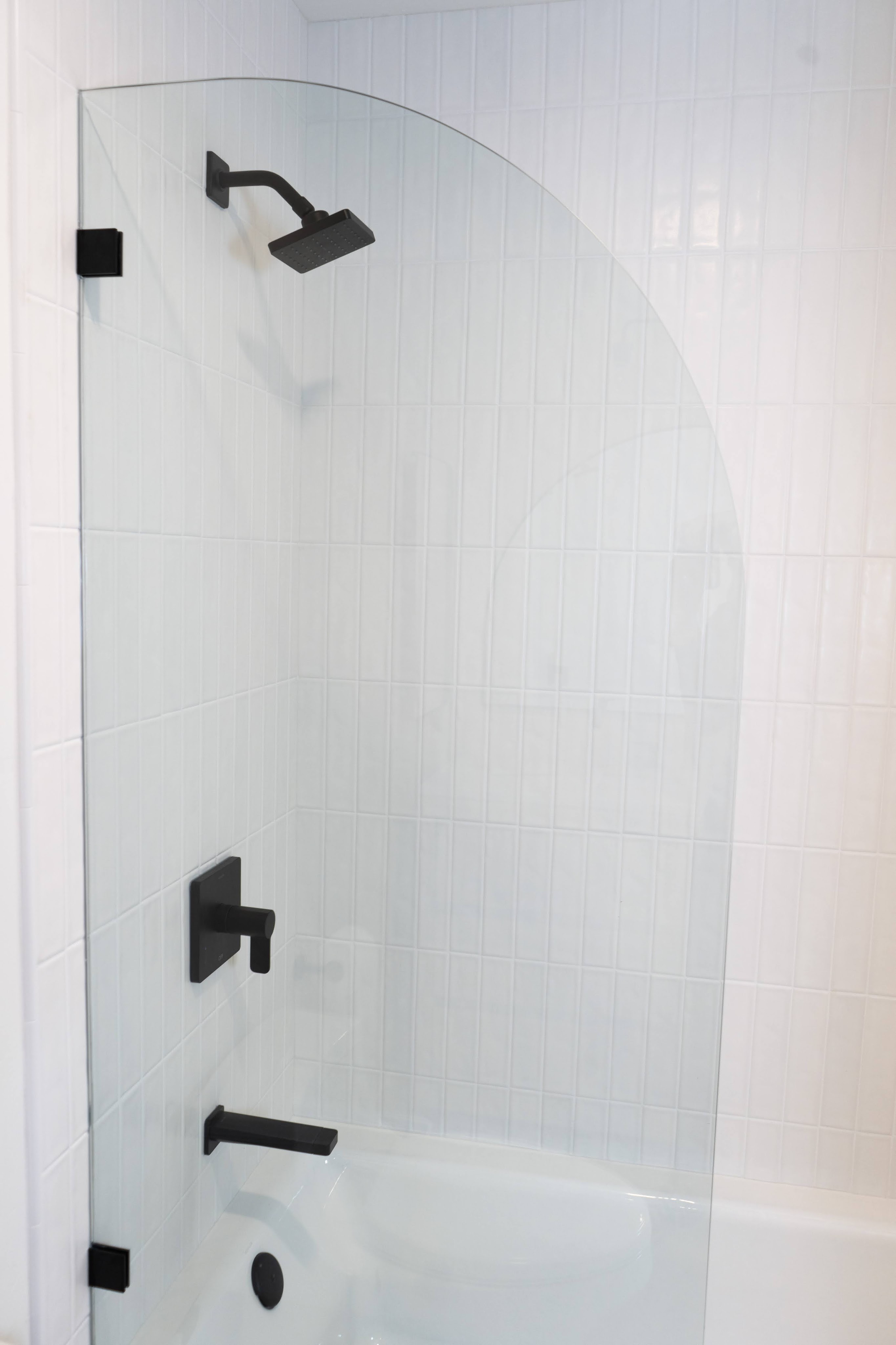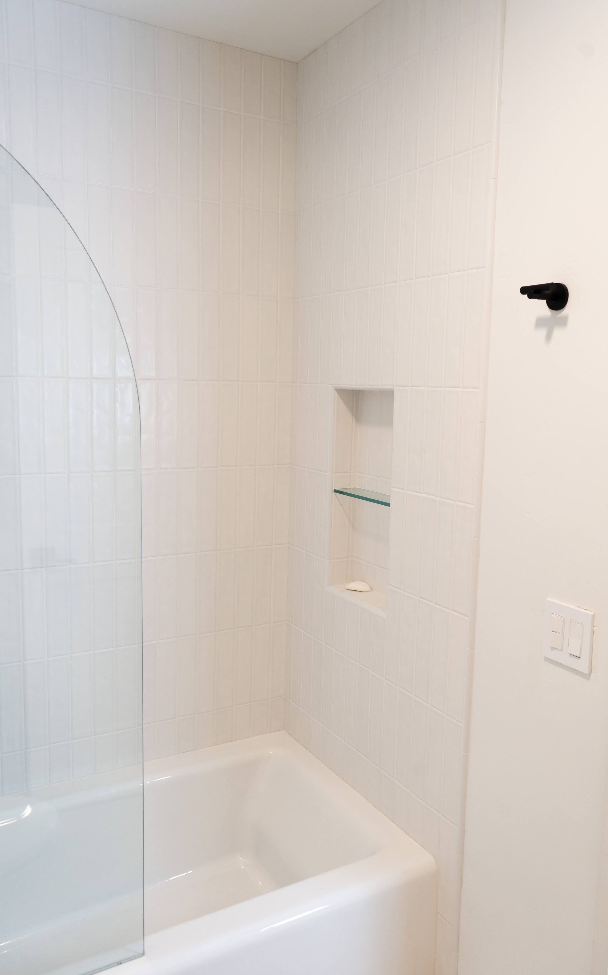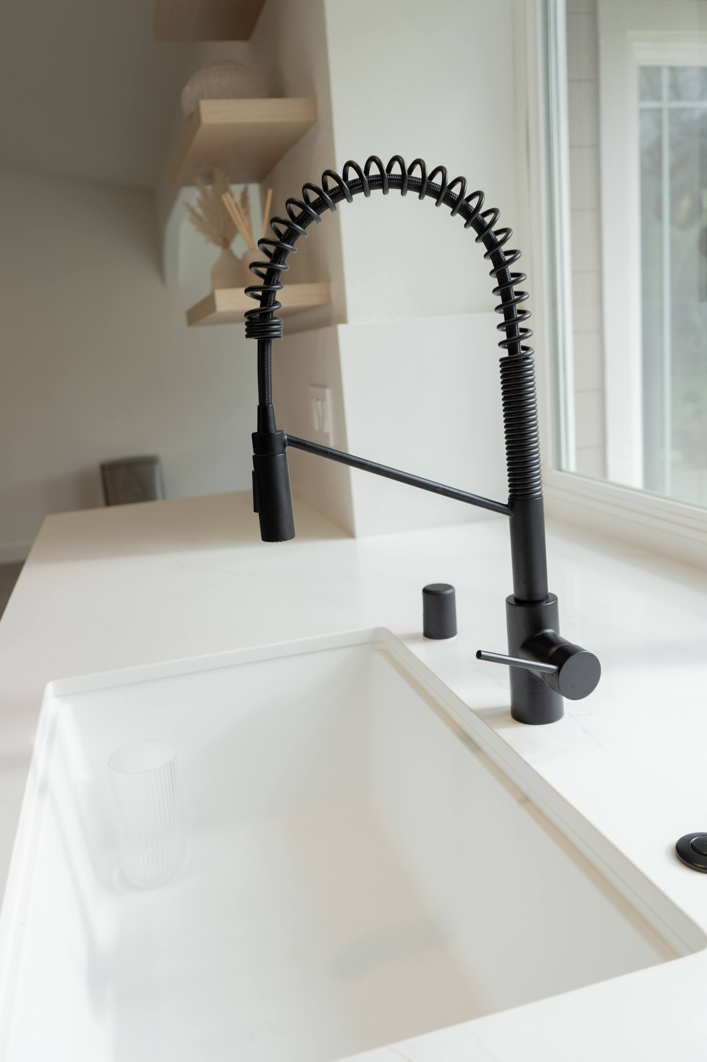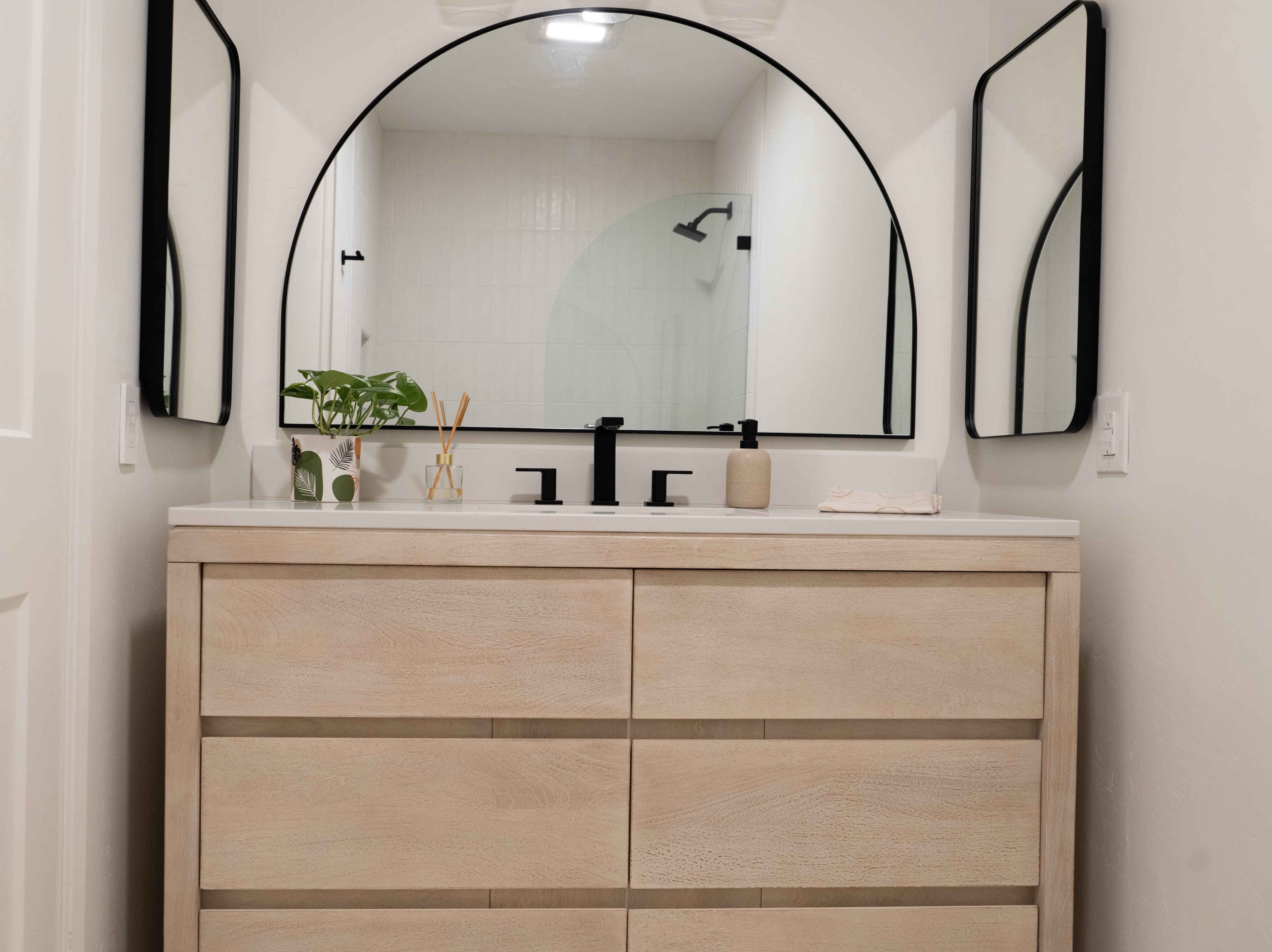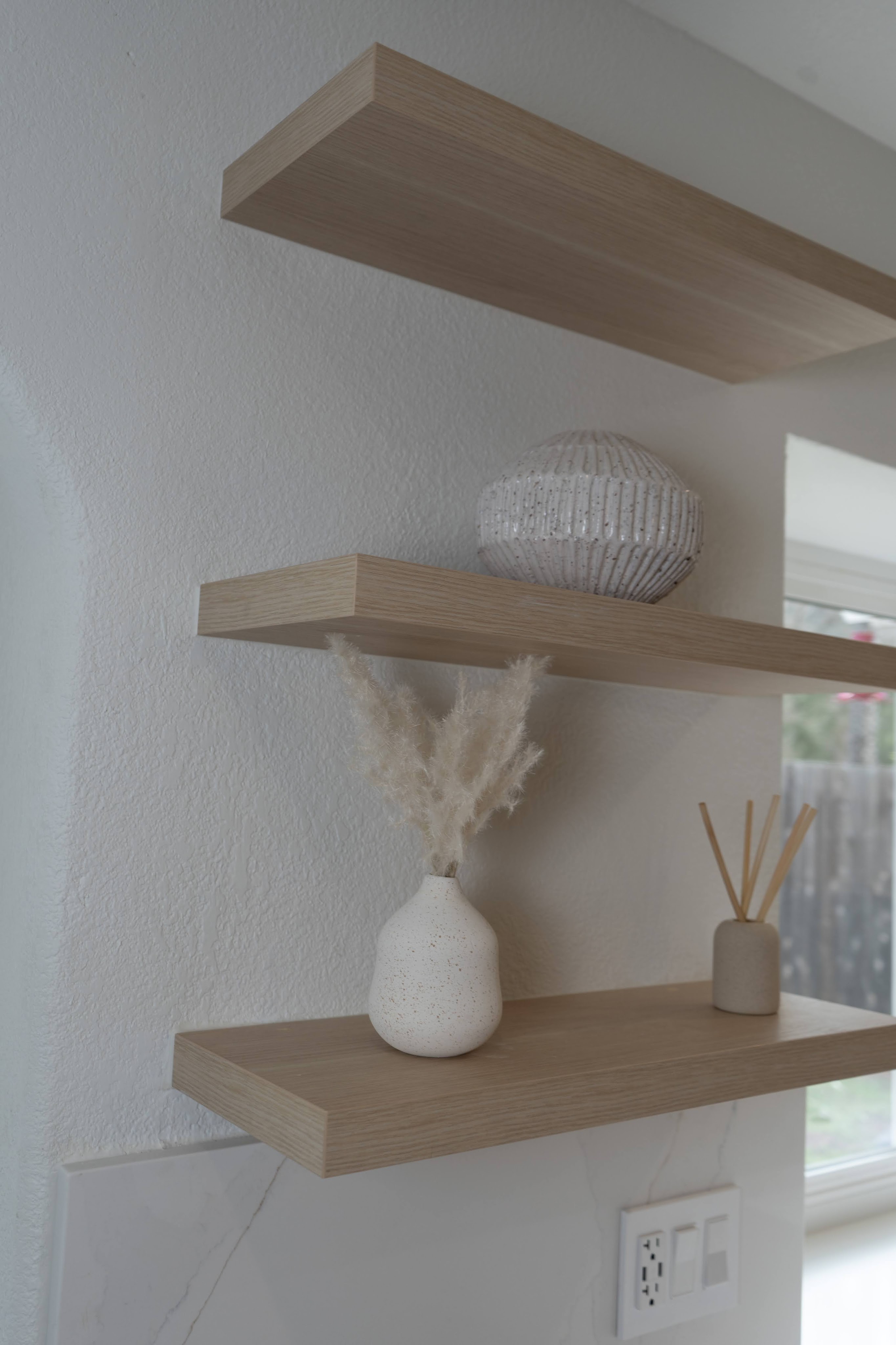 This spacious floor plan came to be after removing central walls and a fireplace that separated the kitchen, living room, and dining spaces. A revamped bathroom adds continuity to the home. Flat paneled, textured laminate, cabinets are durable and easy to clean while still providing a creamy taupe, luxury wood look. Floating shelves near the sink allow for display of keepsakes or easy access for commonly used dishes. A modern Samsung Bespoke refrigerator and range are easy to clean white glass.